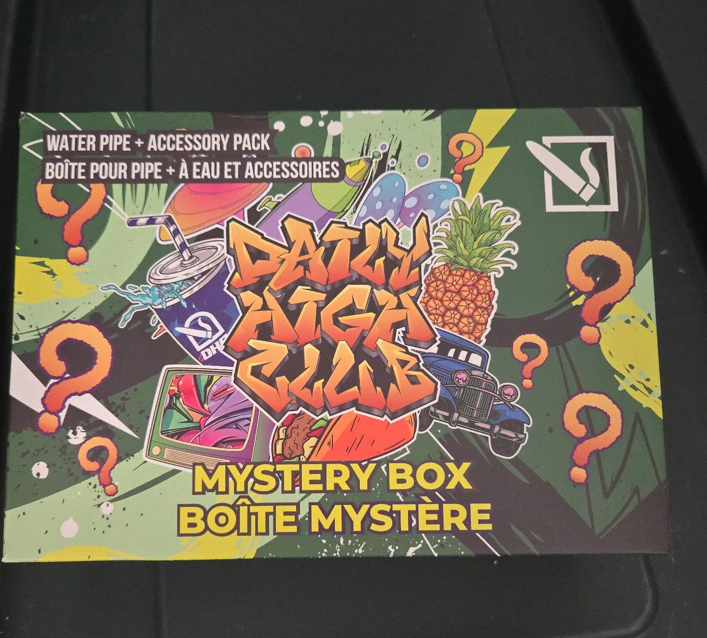This is a DHP High Mystery Box containing a water pipe and accessory pack. It's a mystery box, so contents may vary. The packaging has a vibrant, graffiti-inspired design with various pop culture elements. It's a fun surprise for anyone interested in smoking accessories!