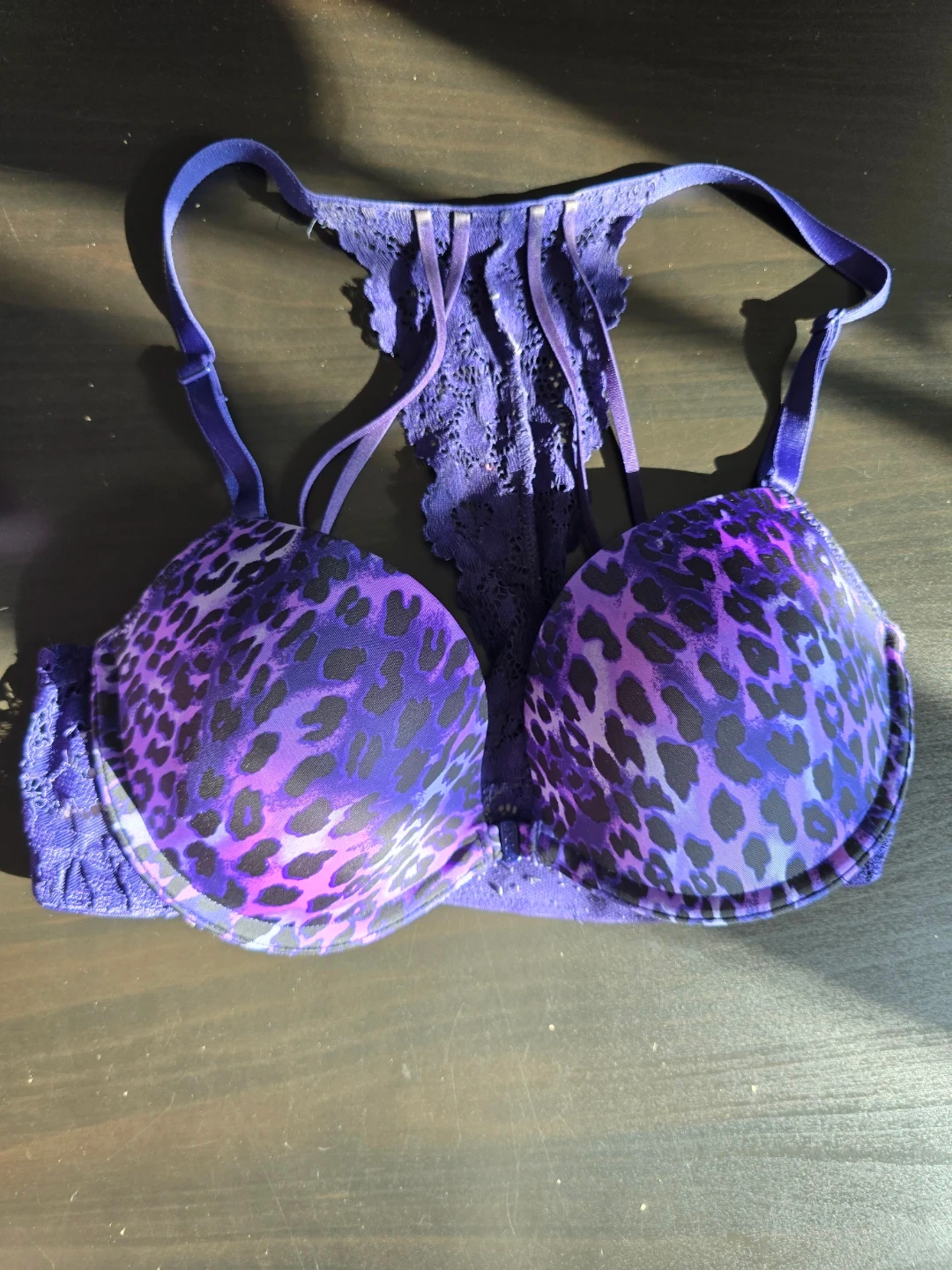 This La Senza purple bra features a vibrant leopard print design. It is a front clasp bra with a gorgeous racerback style back with lace detailing. Adjustable straps ensure a comfortable fit. Lightly lined padding.