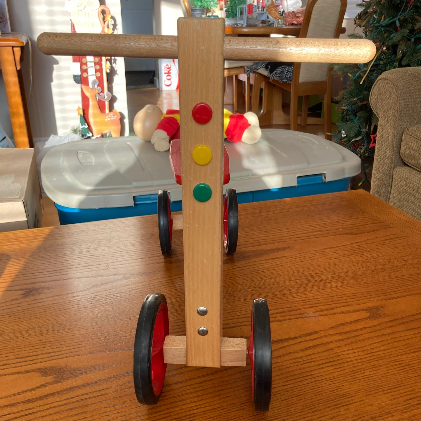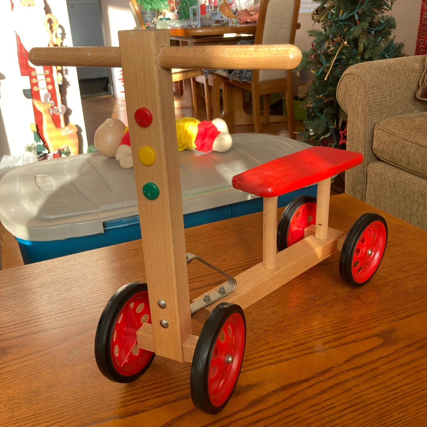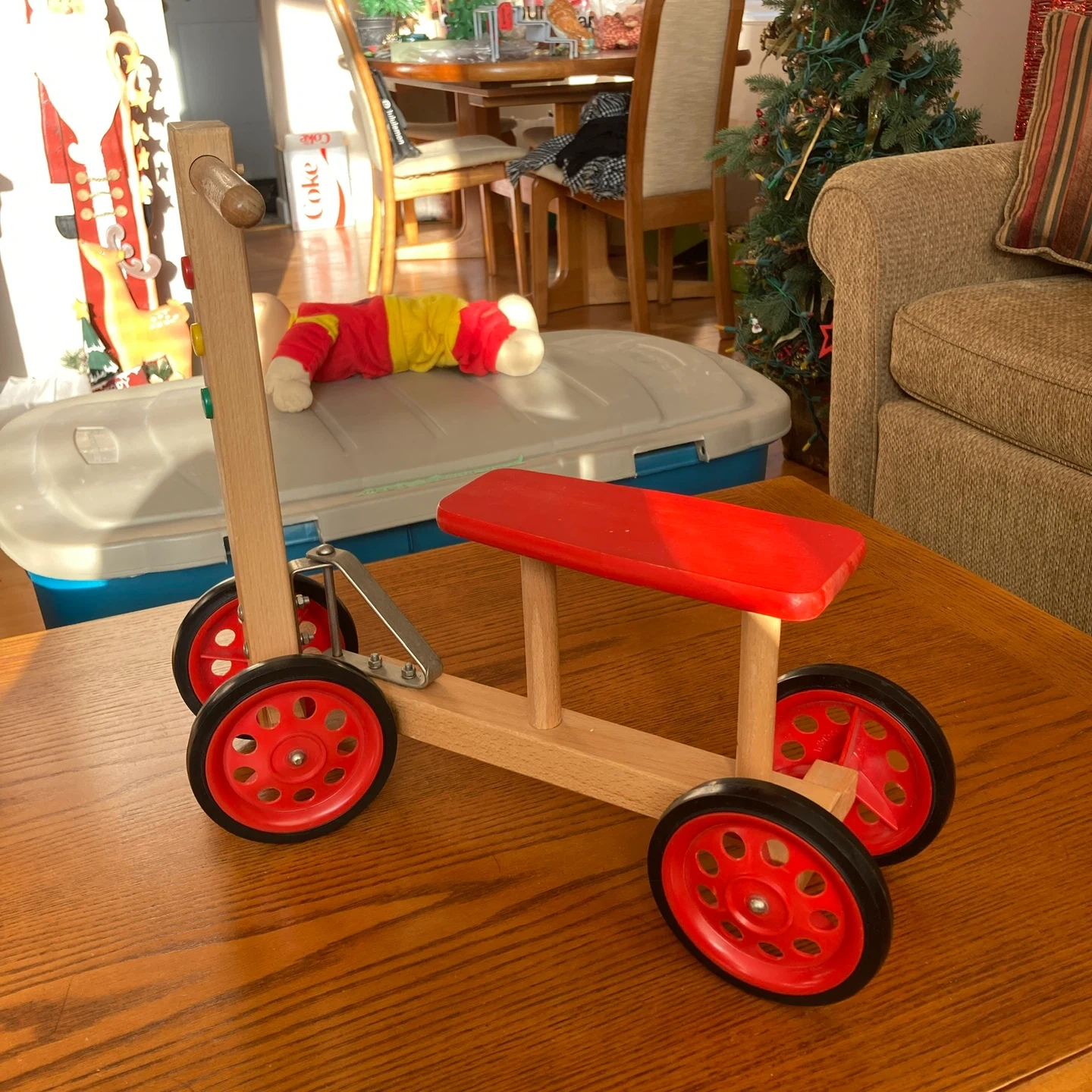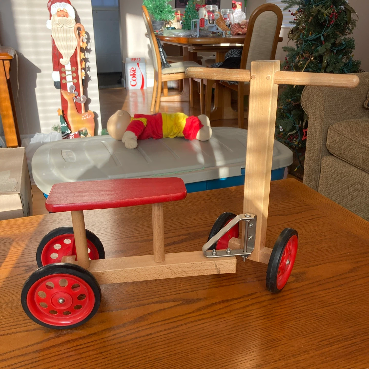 This wooden ride-on toy features a natural wood finish with a red seat and red wheels. It's designed for display or dolls. A fun way to encourage active play!