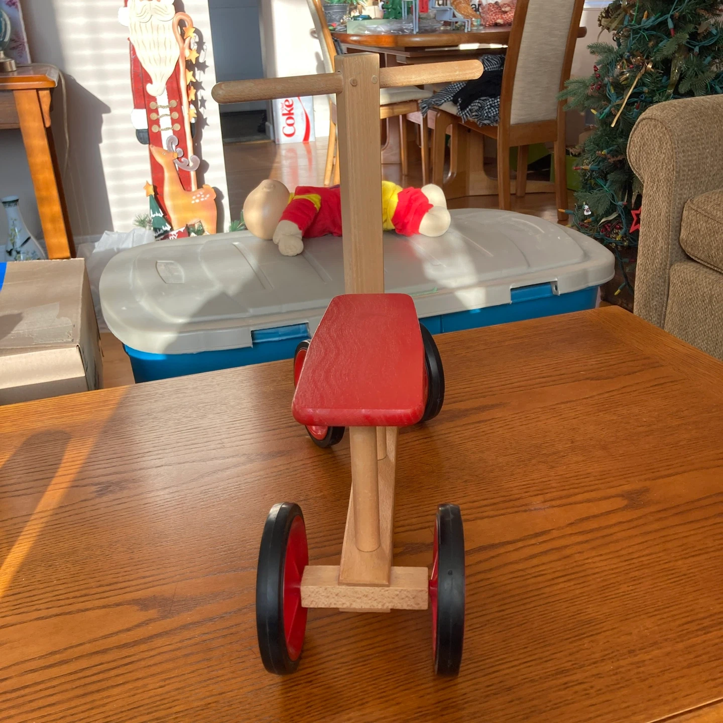 This wooden ride-on toy features a natural wood finish with a red seat and red wheels. It's designed for display or dolls. A fun way to encourage active play!