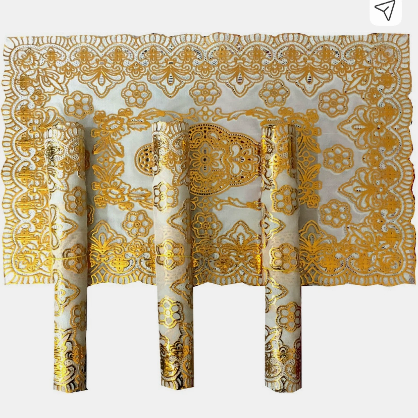 Lovely gold floral patterned tablecloth and four matching placemats. The set features a scalloped edge on the tablecloth and a classic damask-inspired design throughout. Fabric material.