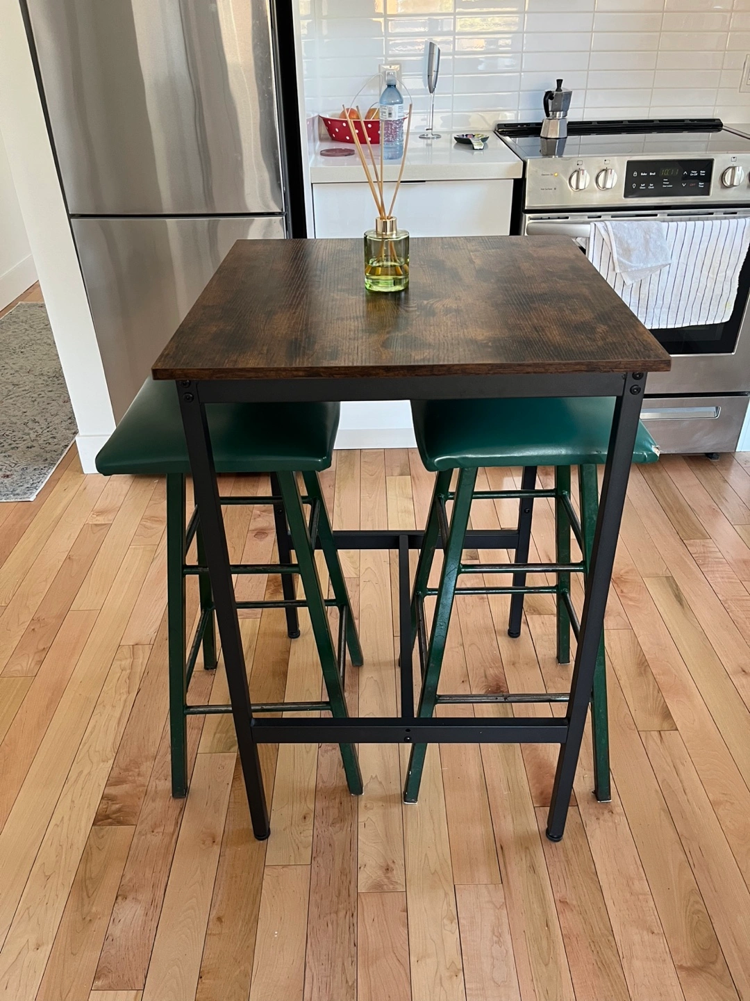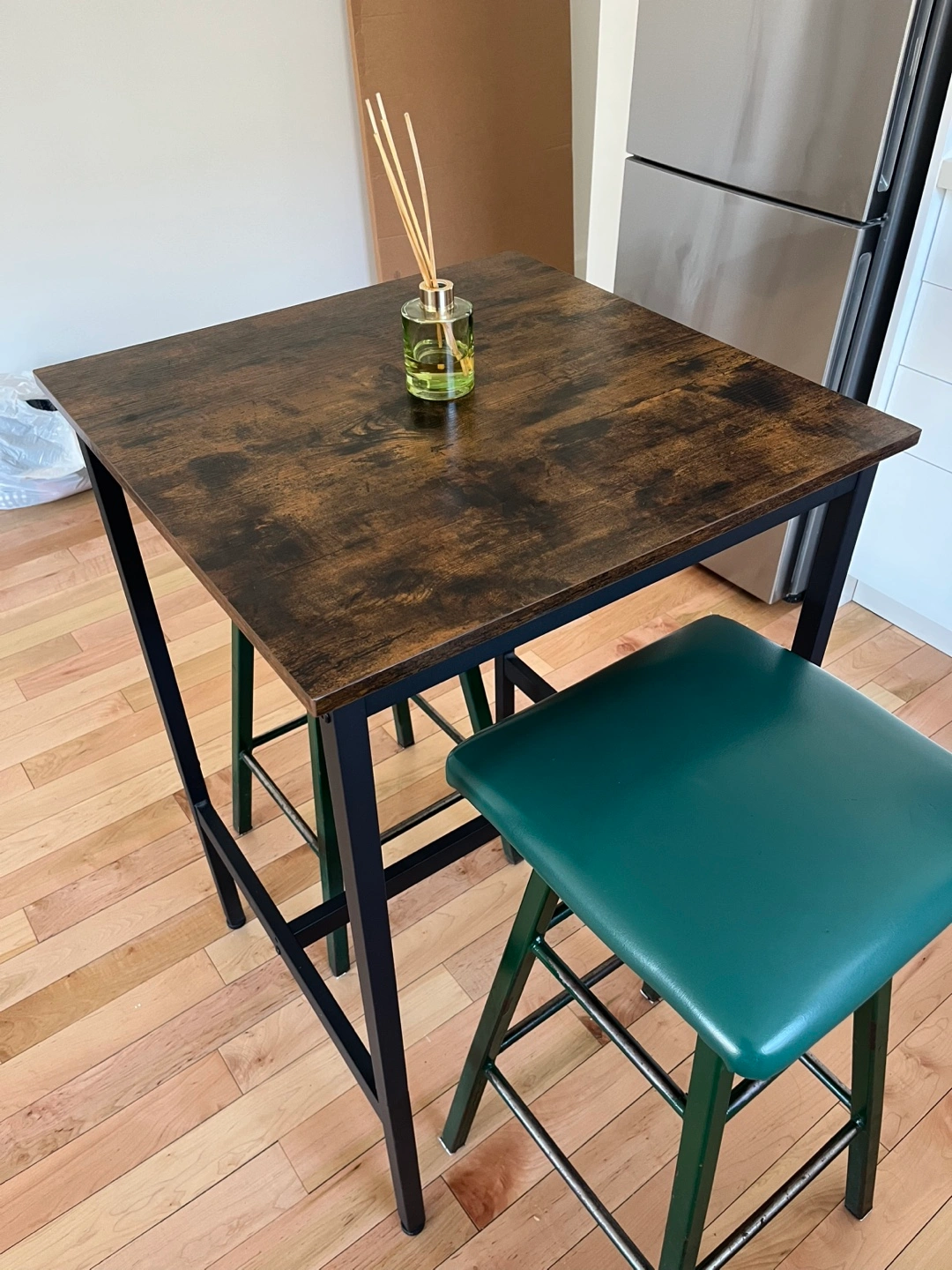 Square table and two green stools. Some wear and tear on stools, but can be easily reupholstered. Dark brown wood-look table top. Black metal frame. Great for a small space. Similar: https://www.wayfair.ca/furniture/pdp/17-stories-mciver-fixed-dining-table-c003151583.html?piid=878950724%2C878950726