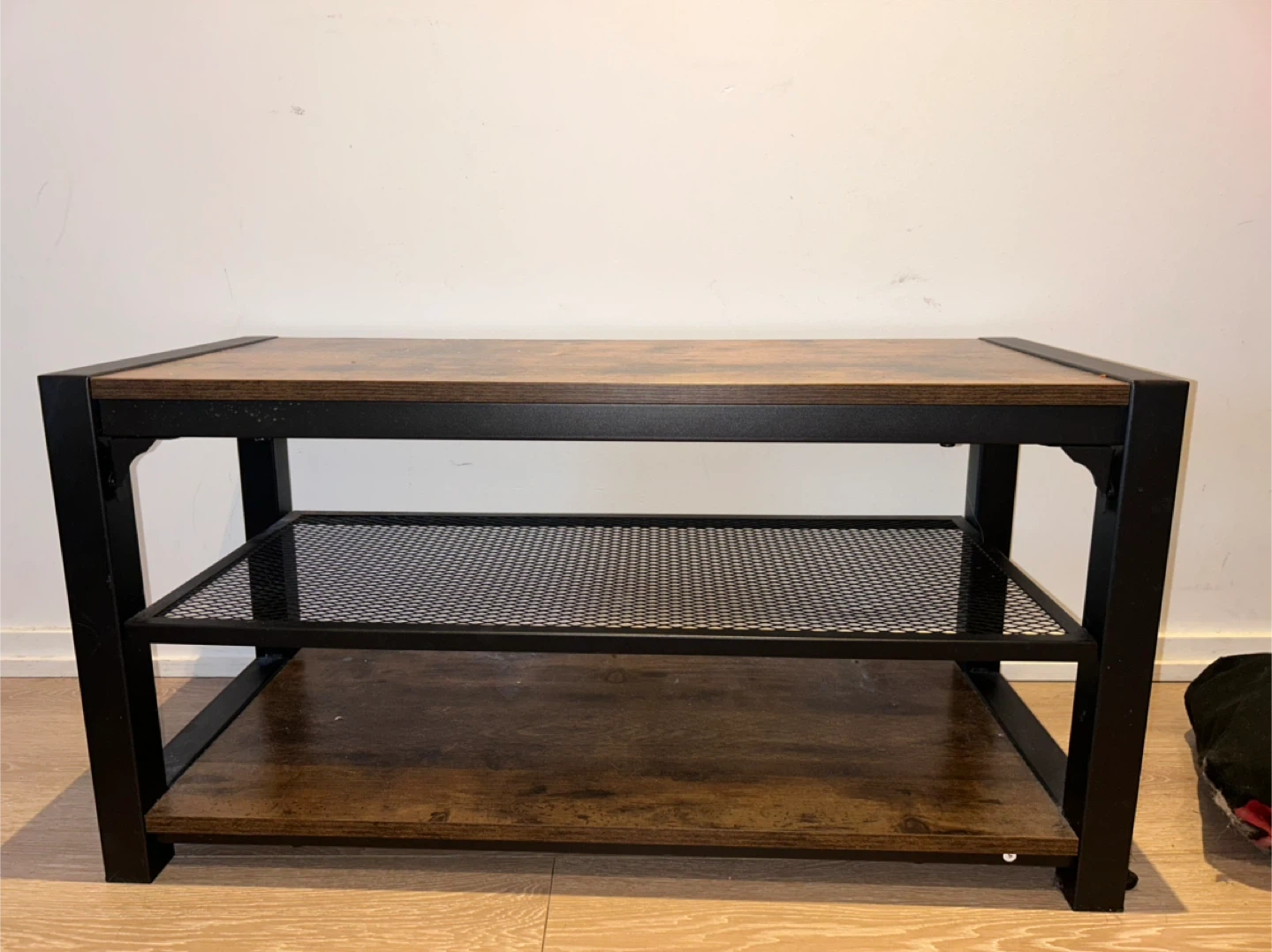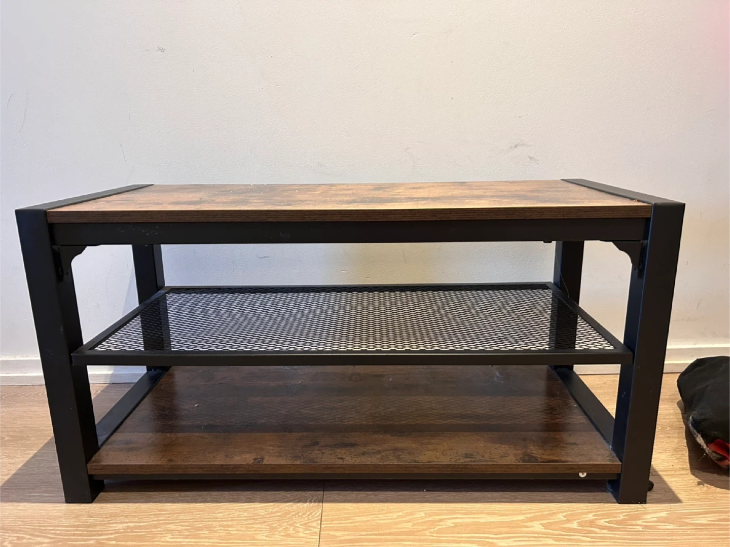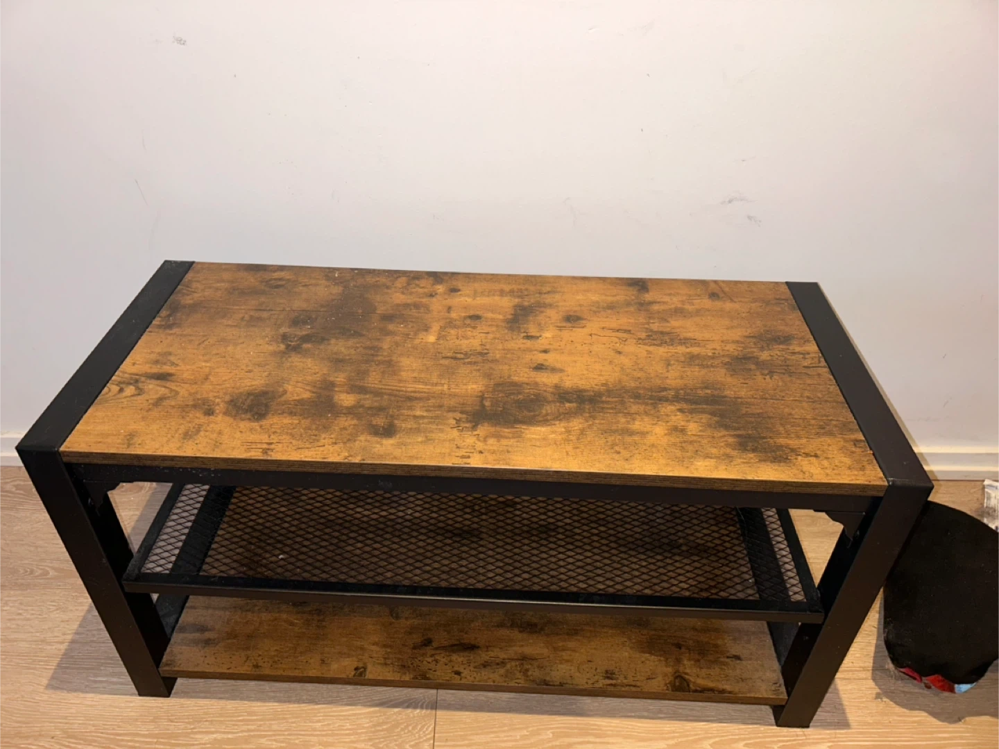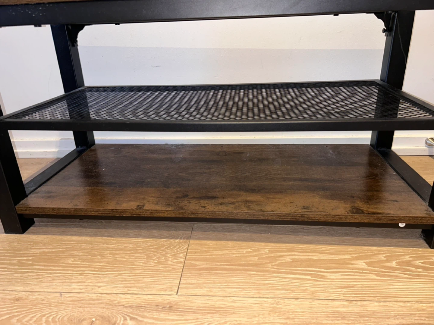 Looking to sell this rustic brown and black TV stand or console table or living room table or shoe rack. It has a sturdy metal frame and two wooden shelves, with a mesh middle shelf. Great for adding some rustic charm to your living room or entertainment area! Pick up 70 temperance street