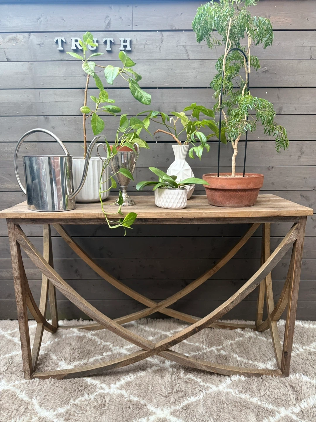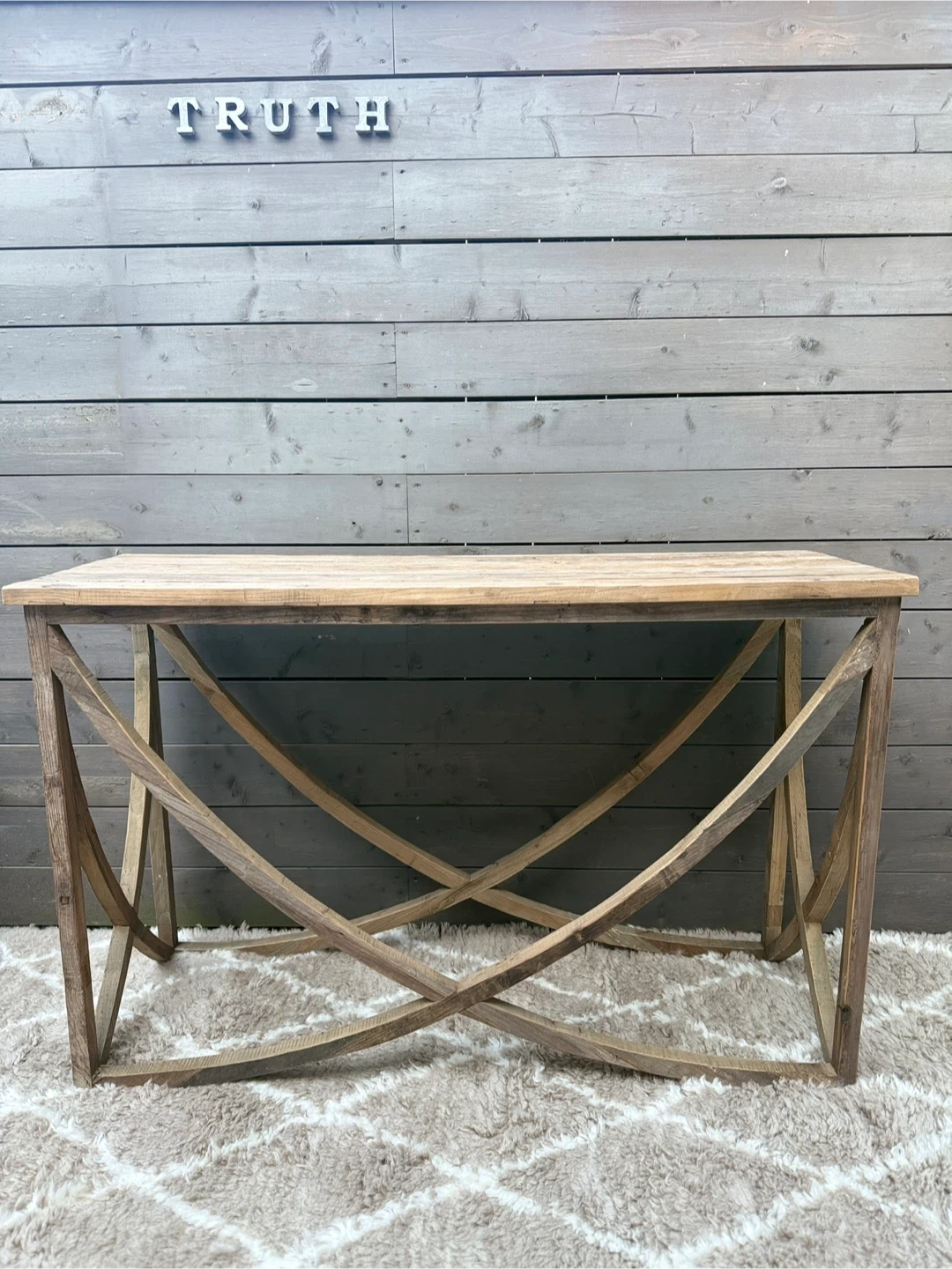 565Selling a rustic wood console table that would look great in an entryway or living room! It has a unique criss-cross leg design and a warm, natural wood finish. It's in great condition and ready for a new home