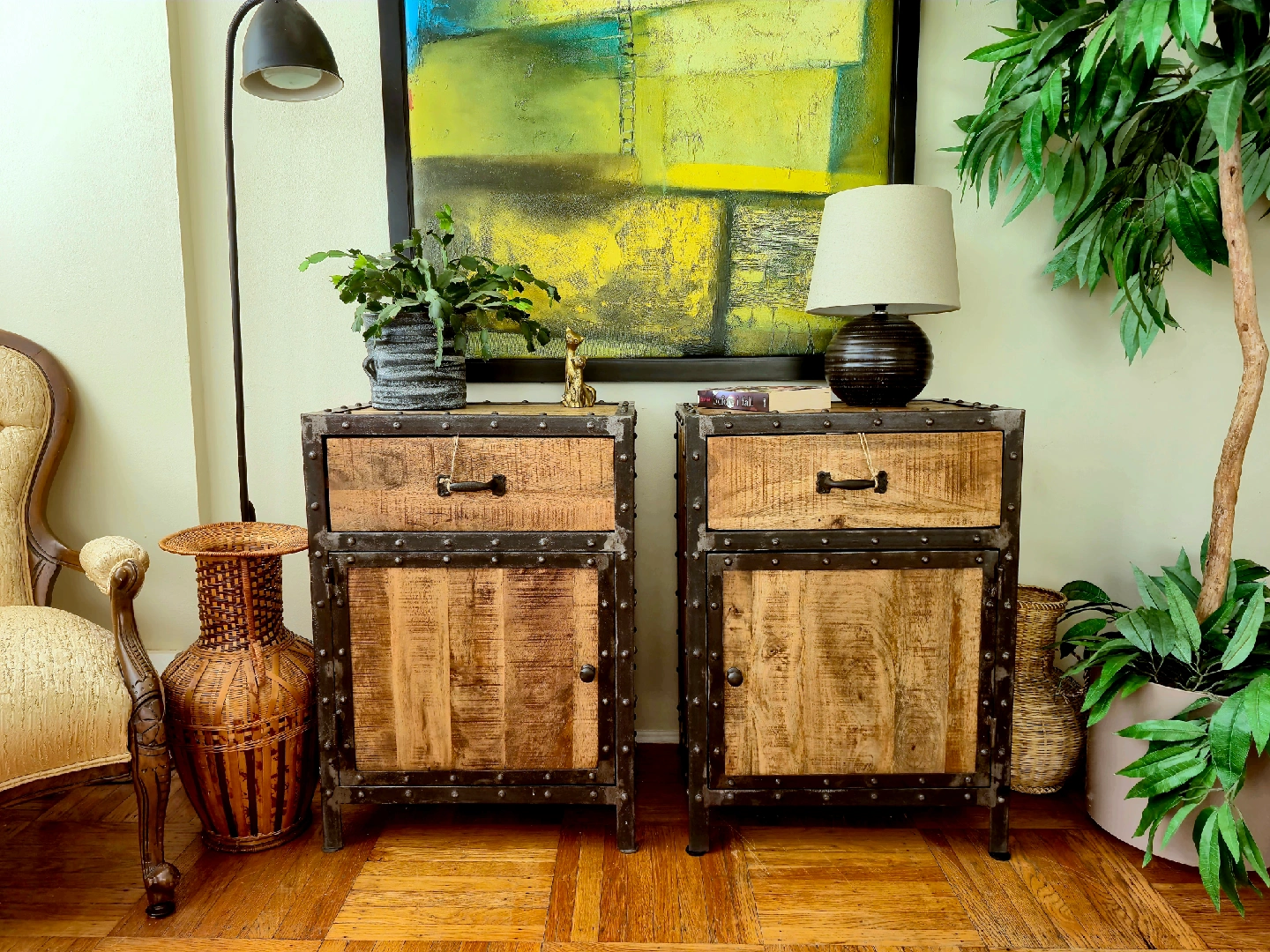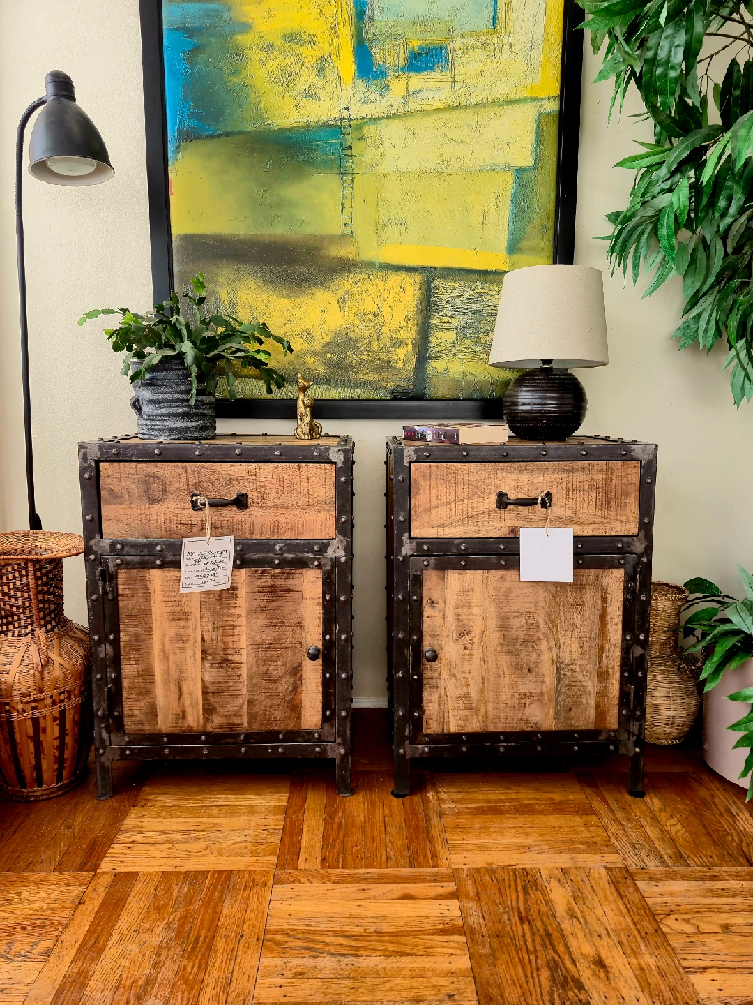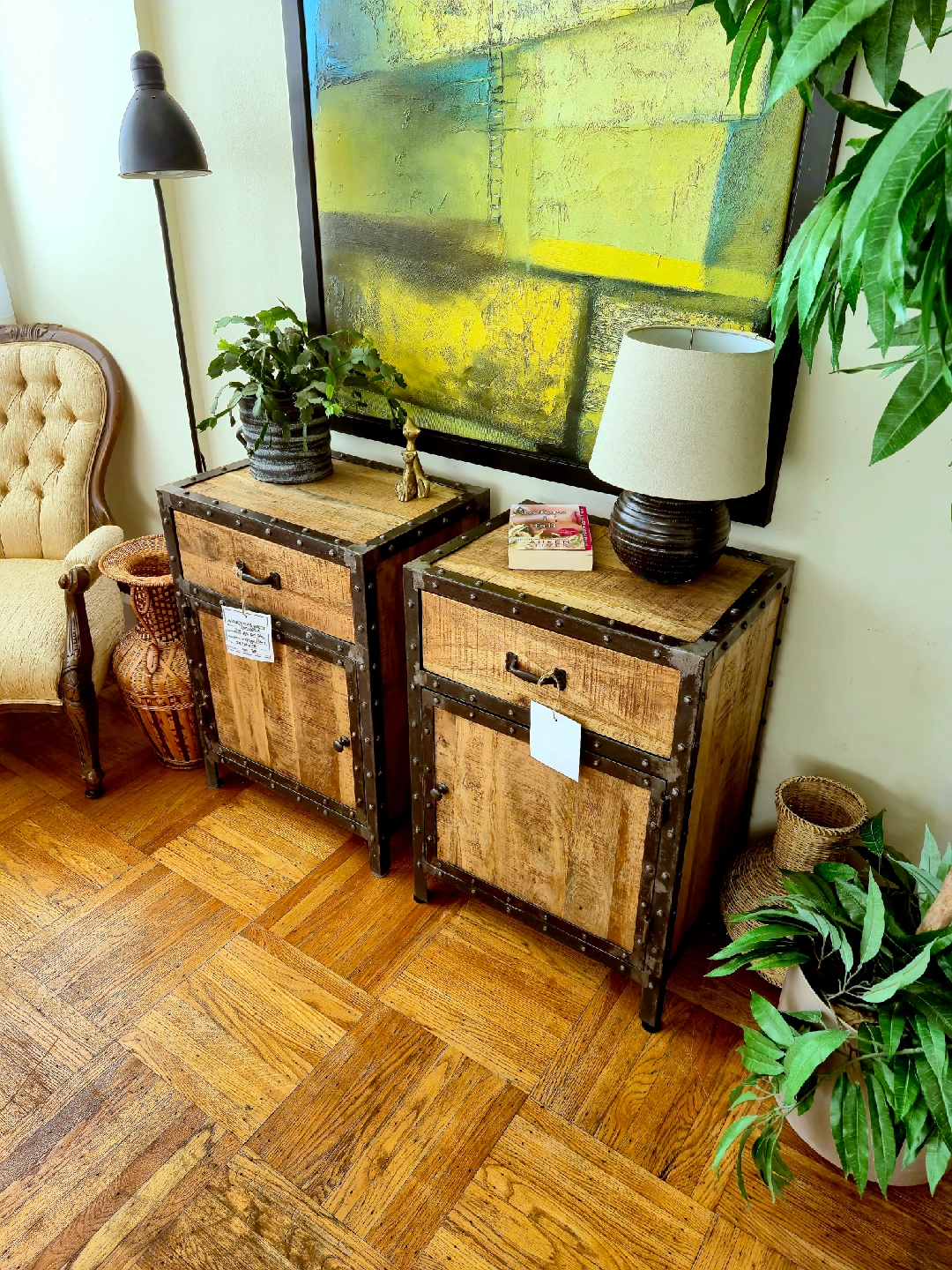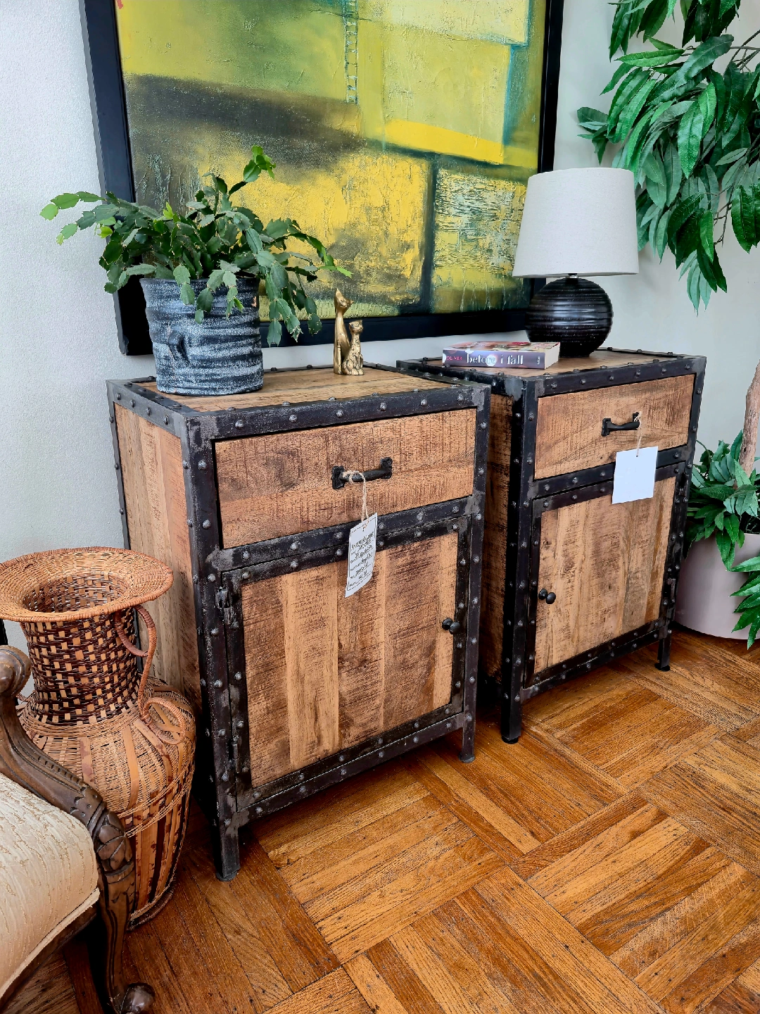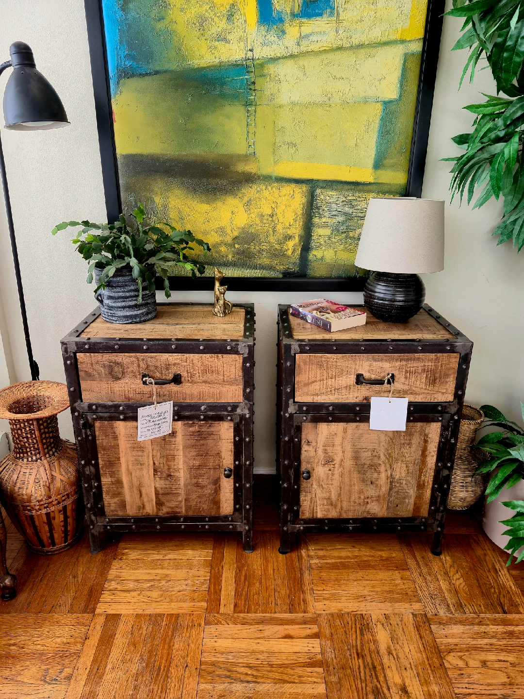 Add character and function to your bedroom or living space with this matching pair of handcrafted bedside tables. Made from solid mango wood with sturdy iron framing, these tables combine rustic warmth with industrial edge. Dimensions: 20” W x 15” D x 28” H Features 1 spacious drawer and 1 cabinet for versatile storage Sturdy iron rivet details and handles for an authentic industrial look Natural mango wood grain ensures each piece is unique Pick up in downtown Vancouver or delivery may be arranged for a reasonable fee. Priority is given to those who are able to pick up. Follow us on Instagram to enjoy an exclusive discount on select furniture items: https://www.instagram.com/vanvaluevintage Tags: retro vintage antique 1940s 1950s 1960s 1970s sixties mcm mid century modern furniture teak walnut cb2 eq3 west elm pottery barn crate and barrel structube article urban barn moes chest of drawers wardrobe dresser lowboy brass gold guild bedroom storage credenza sideboard server buffet side table set dec rental film