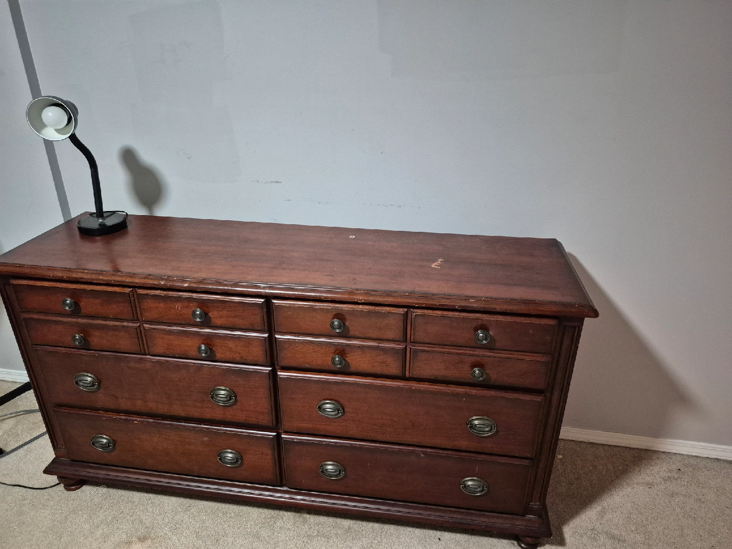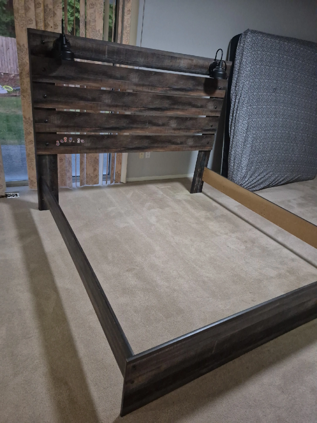 10Selling a rustic-style wood bed frame and dresser set. The bed frame has a unique headboard design with attached lamps. The dresser is a classic piece with multiple drawers, perfect for adding character to any bedroom.. INCLUDING BOX SPRING AND MATTRESS
