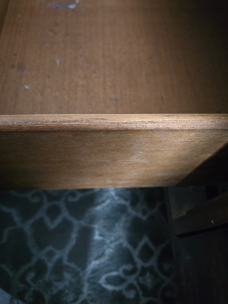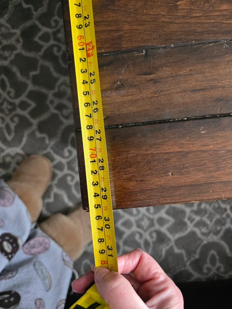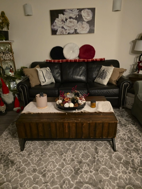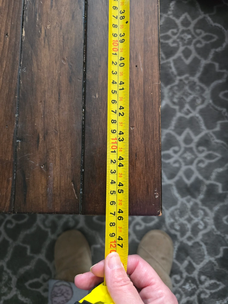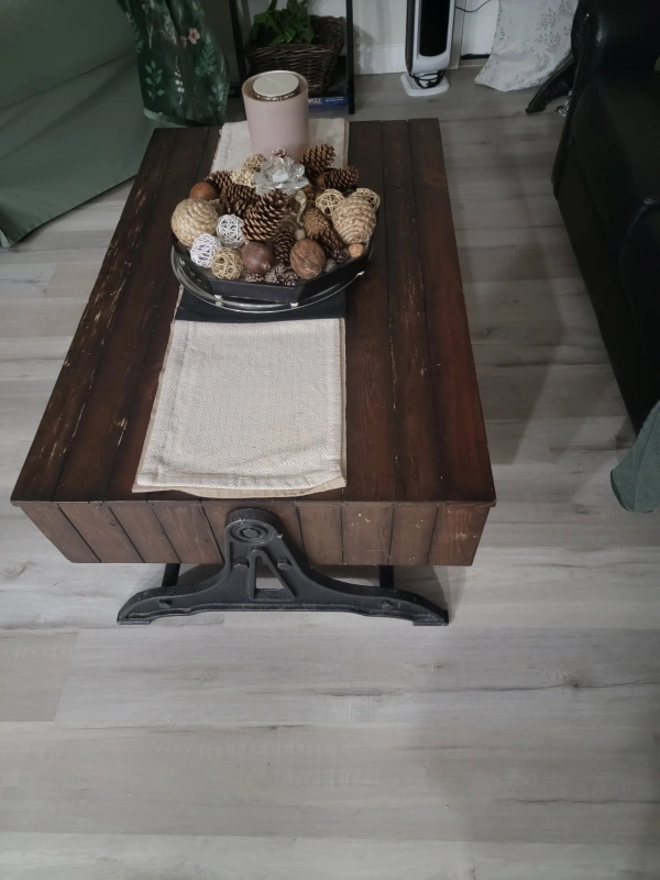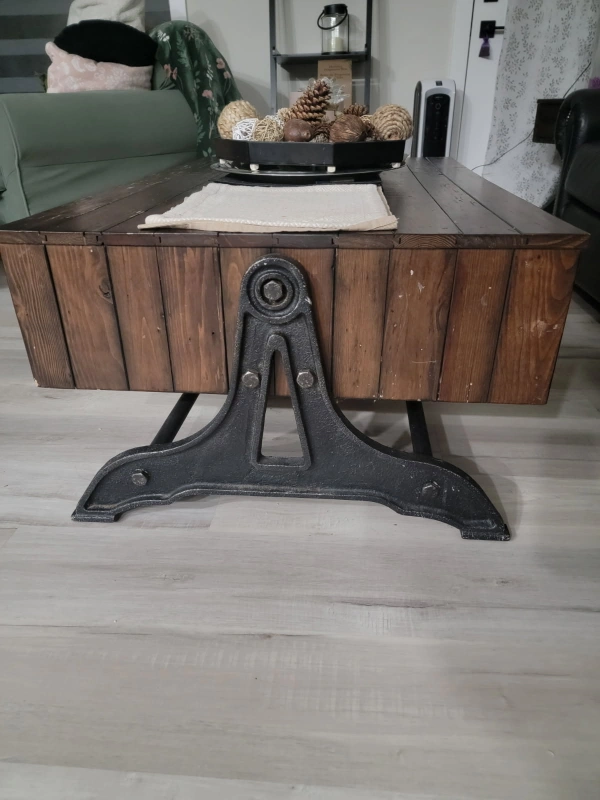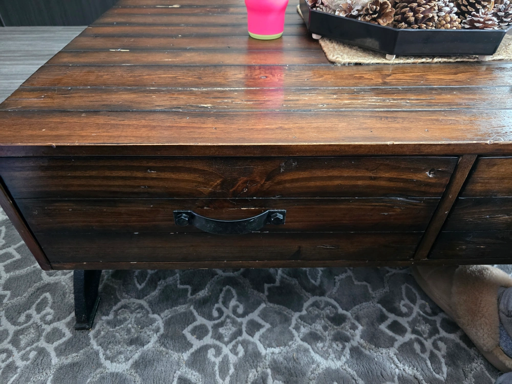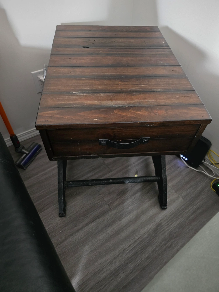 10Dark brown wood end table. Features a single drawer with a black metal handle. Simple, industrial style. Minor wear consistent with use. coffee table has 2 drawers and a solid rod iron base. Will last a life time!