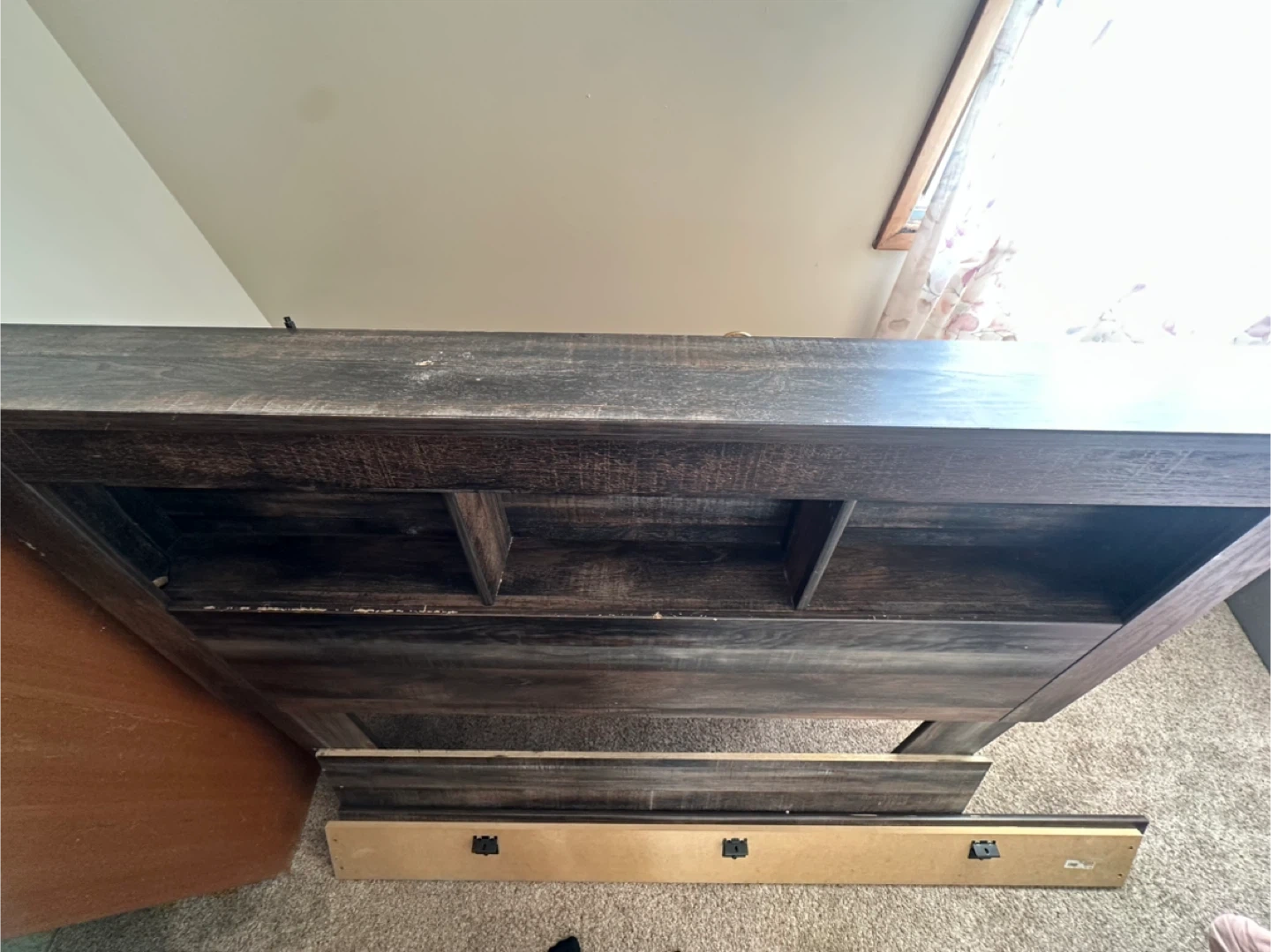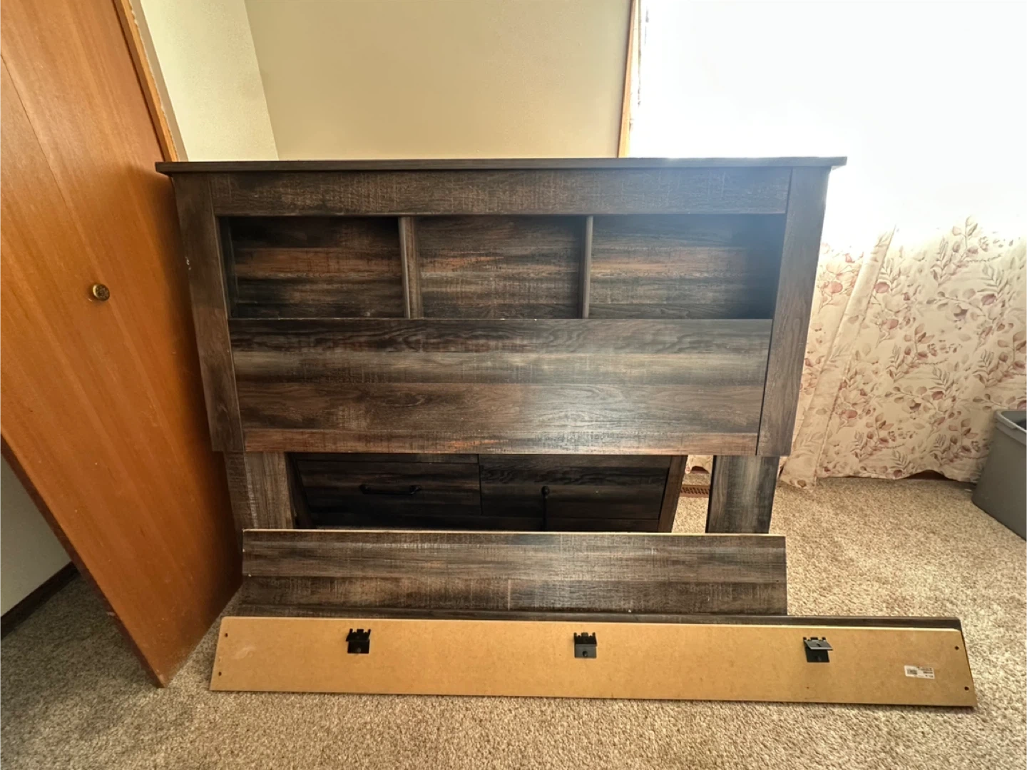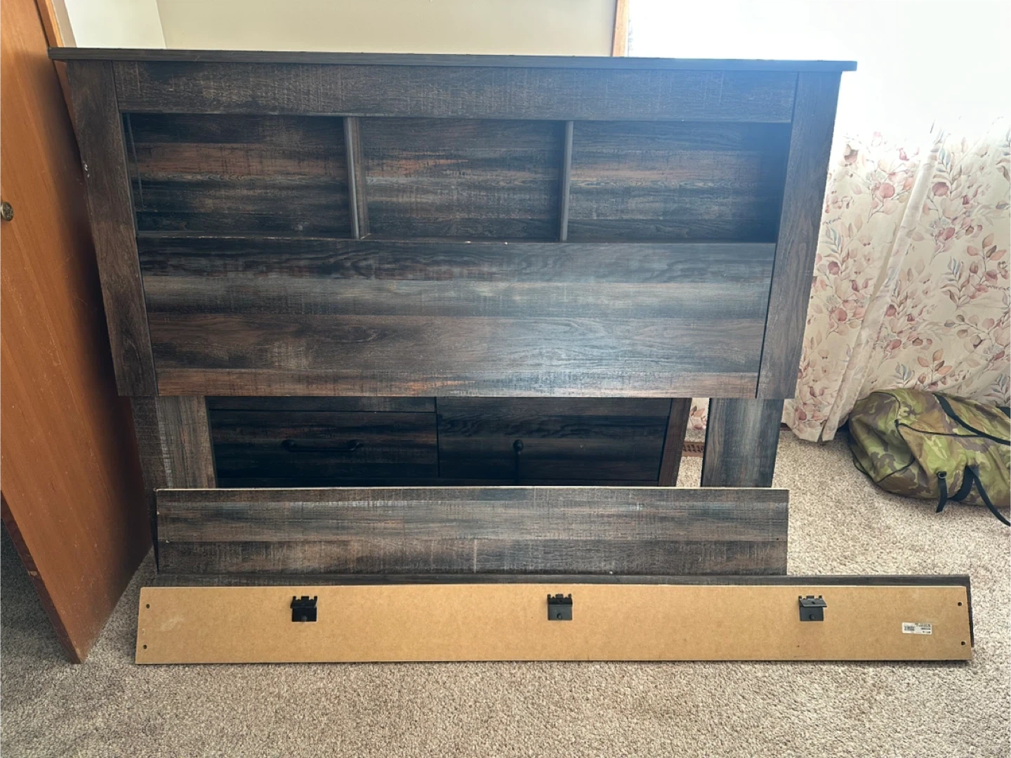5Queen size bed frame. Some minor scratches (pic #3). All the pieces are there, screws and all. There’s LED lights attached, no remote. But I’m sure you can order something cheap online or something or replace them.
