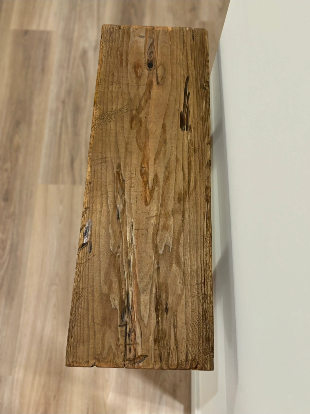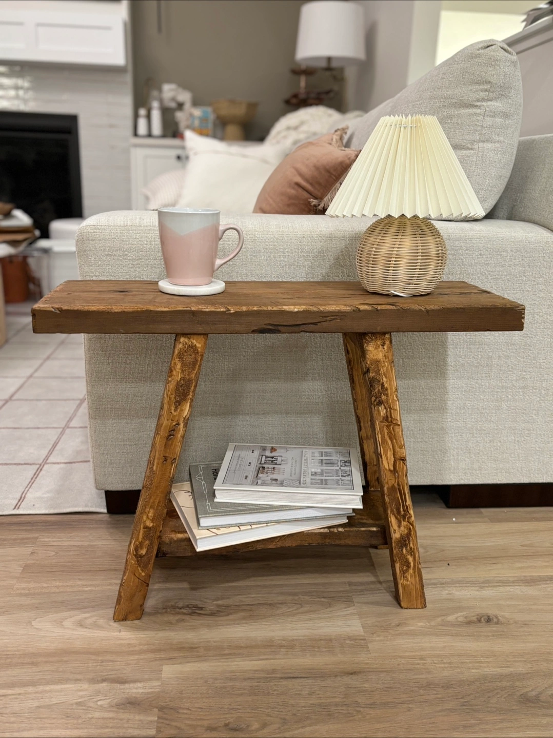 76Selling a rustic wood side table, perfect for adding a touch of natural charm to your space! It features a unique design with sturdy legs and a lower shelf for extra storage or display. Measuring 27” in length, 9.25” in width, and 19.75” tall