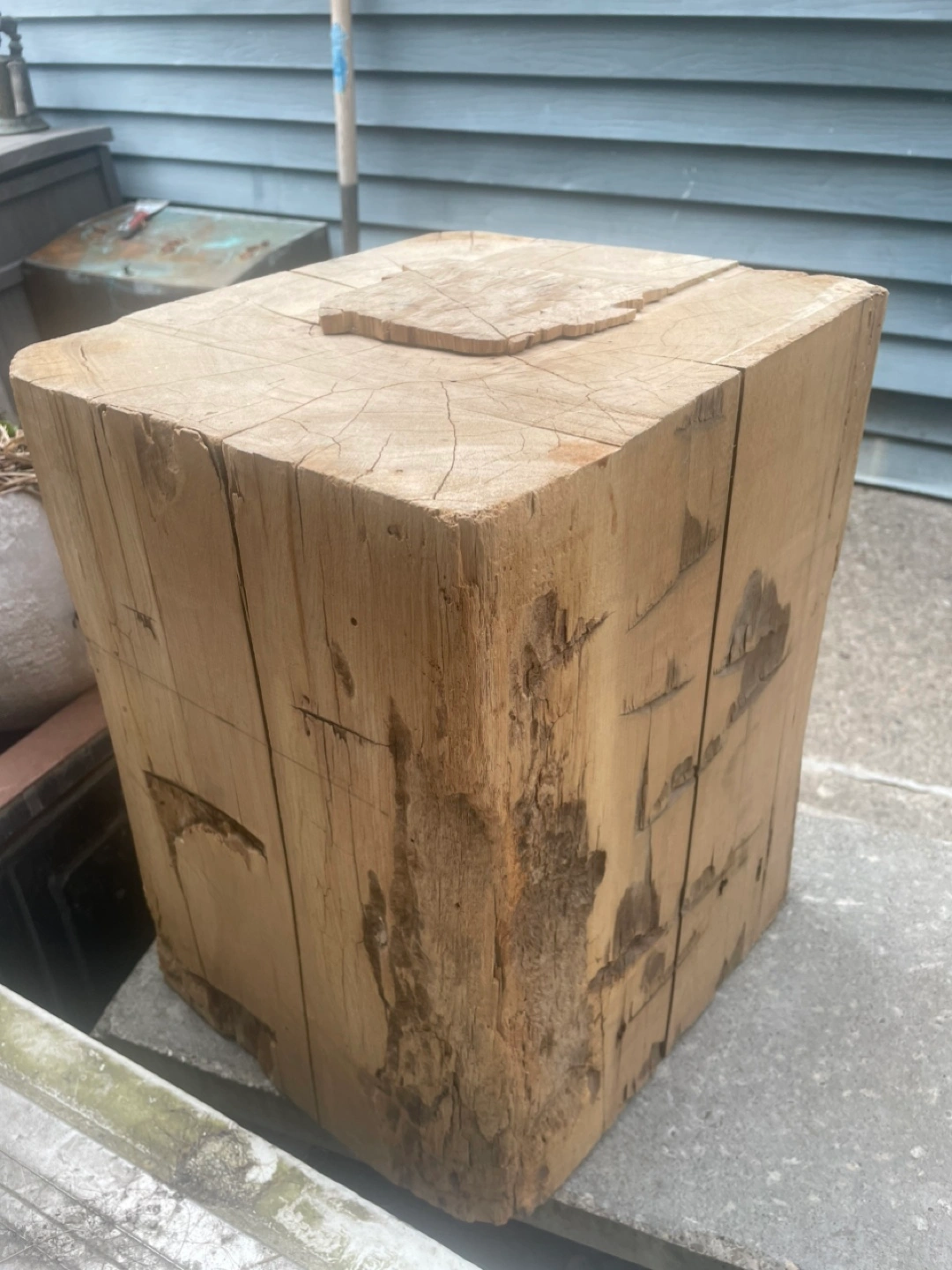 Block of wood from Toronto watehouse beam, solid, heavy. Great patina Used indoors as a side tables Pickup only Bloor & Bathurst No holds sorry we move tmrw Cash only please