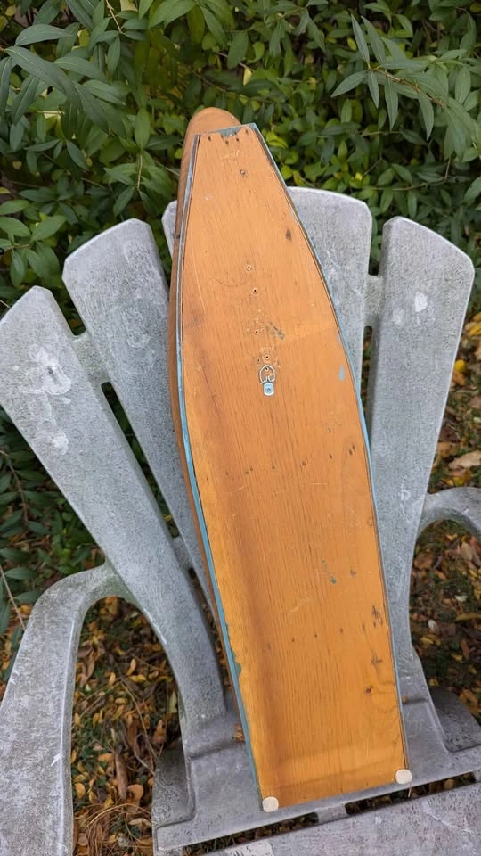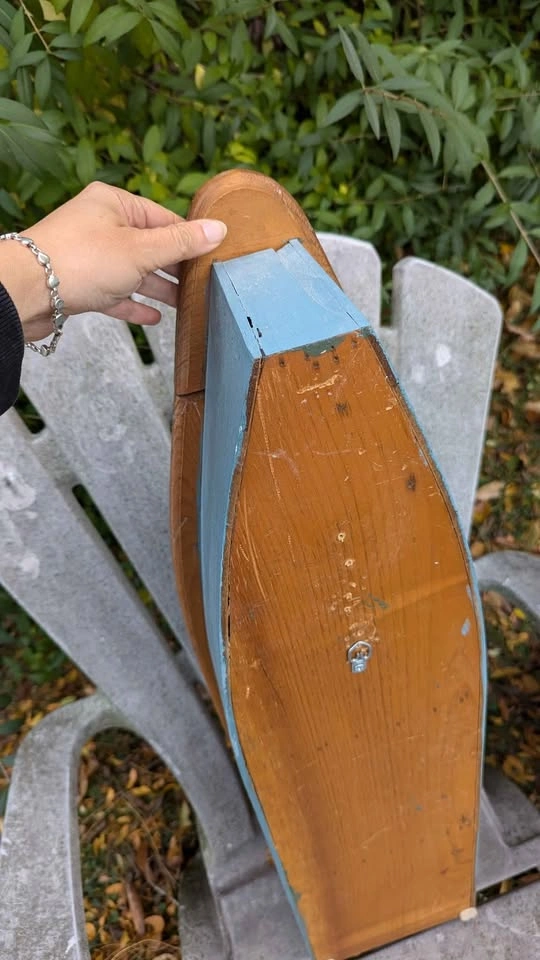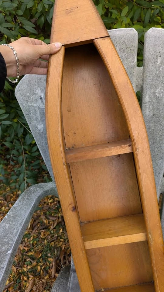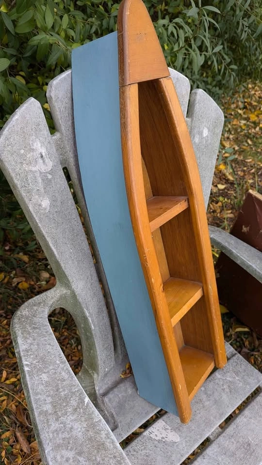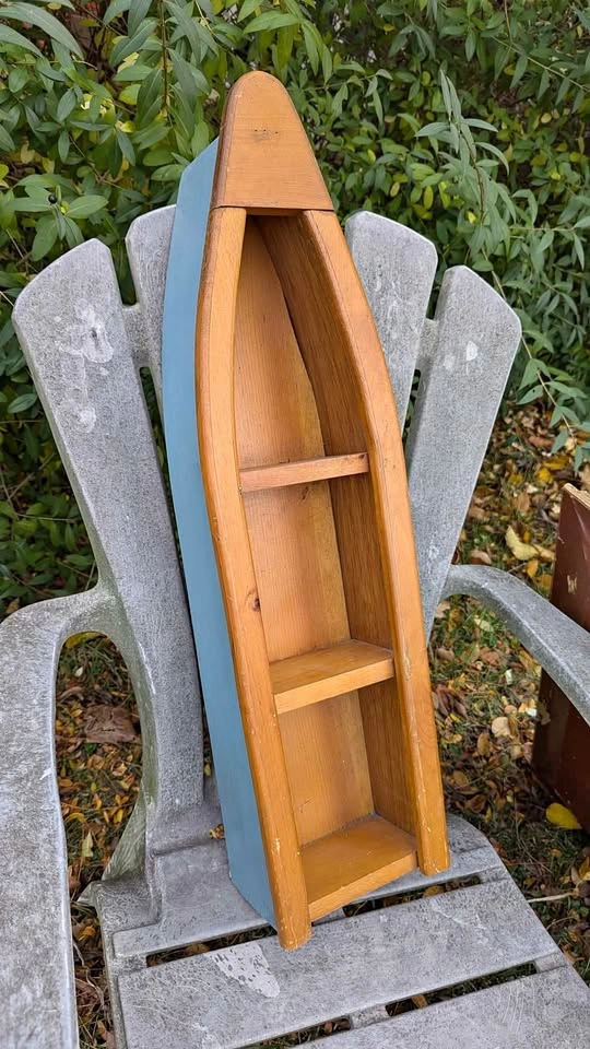 170Cozy cottage or coastal vibes, a charming wooden boat-shaped shelf. Handmade from solid wood, featuring a natural pine front with a blue-painted back for a classic nautical look. Approx. dimensions: Height: 24" (61 cm) Width: 8" (20 cm) Depth: 4" (10 cm) Includes two fixed shelves for displaying shells, candles, small plants, bathroom décor and more. Ready to hang with attached hardware on the back. Condition: Gently used vintage look with minor wear (small scuffs, light scratches, some natural wood patina), adds to its rustic charm. Would look great in: Cottage or cabin décor Lake house Kids’ room Beach or nautical-themed bathroom Check my other listings for similar items! Pick up Burlington 📍 Porch pickup available payment only etransfer to hold, or same day pickup Cash, etransfer