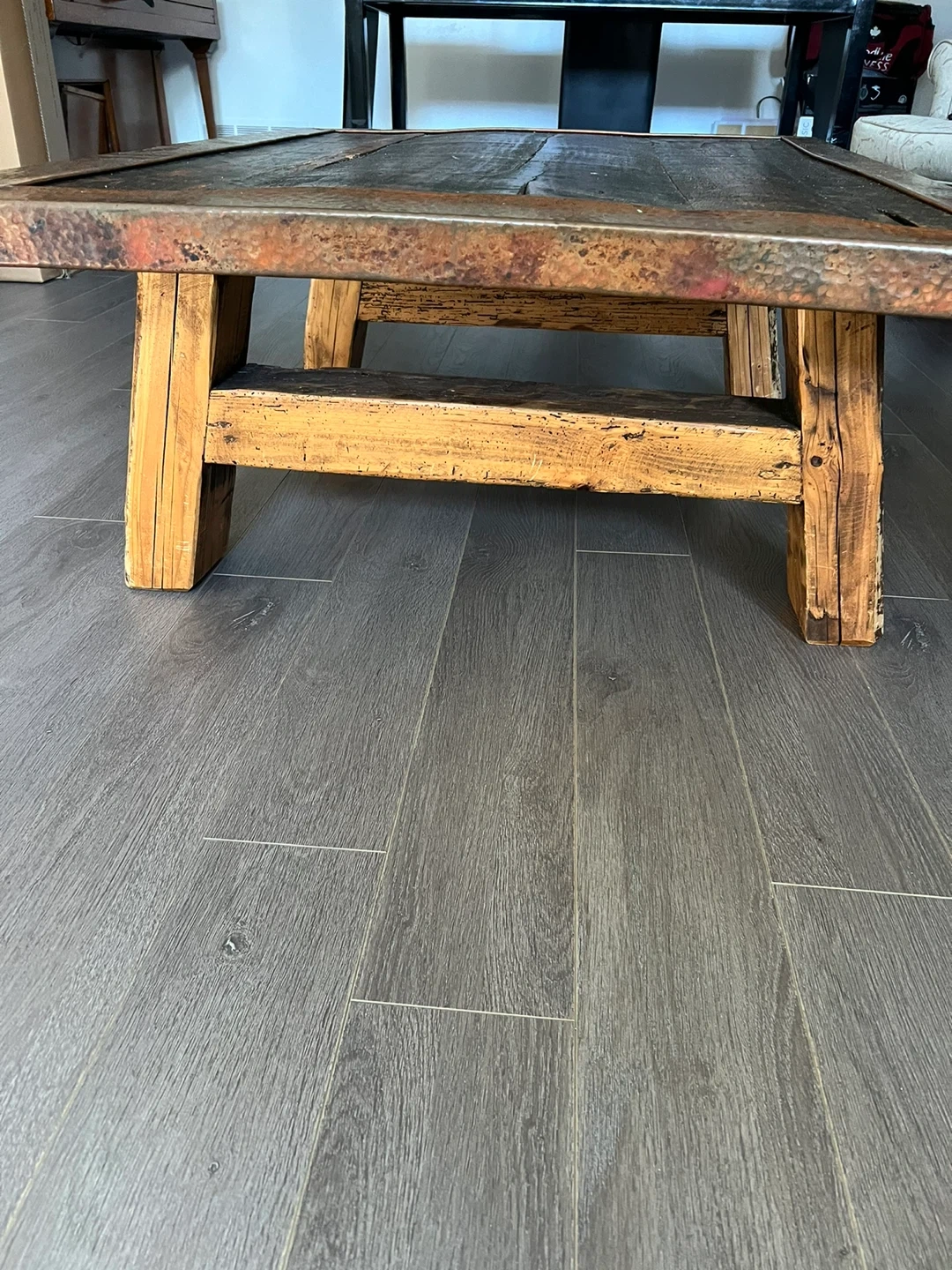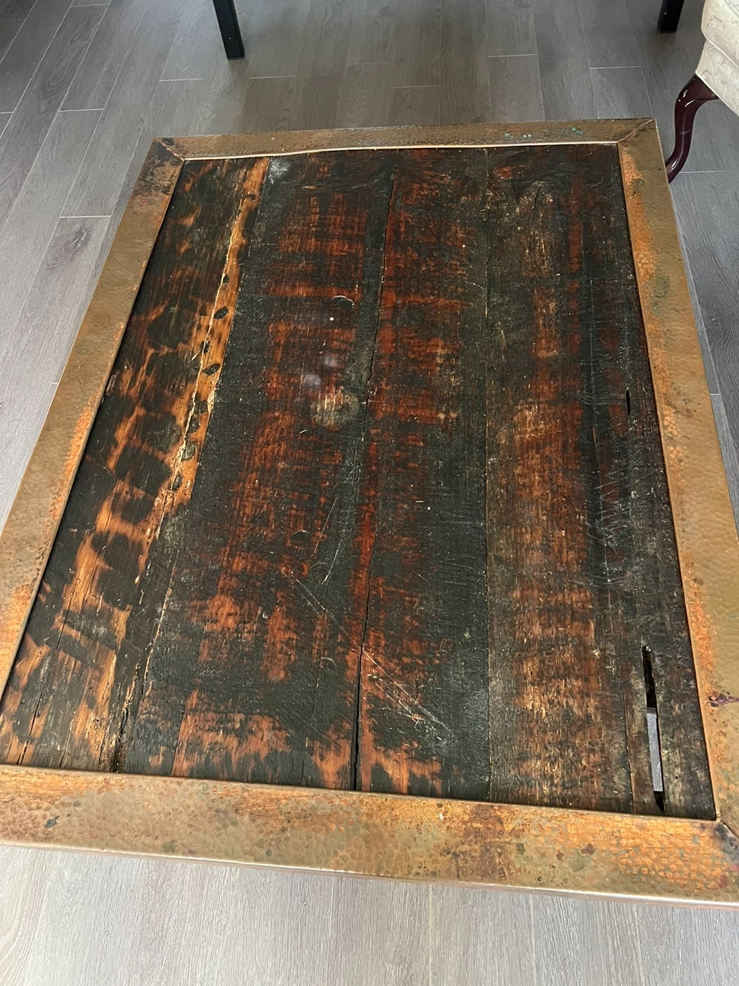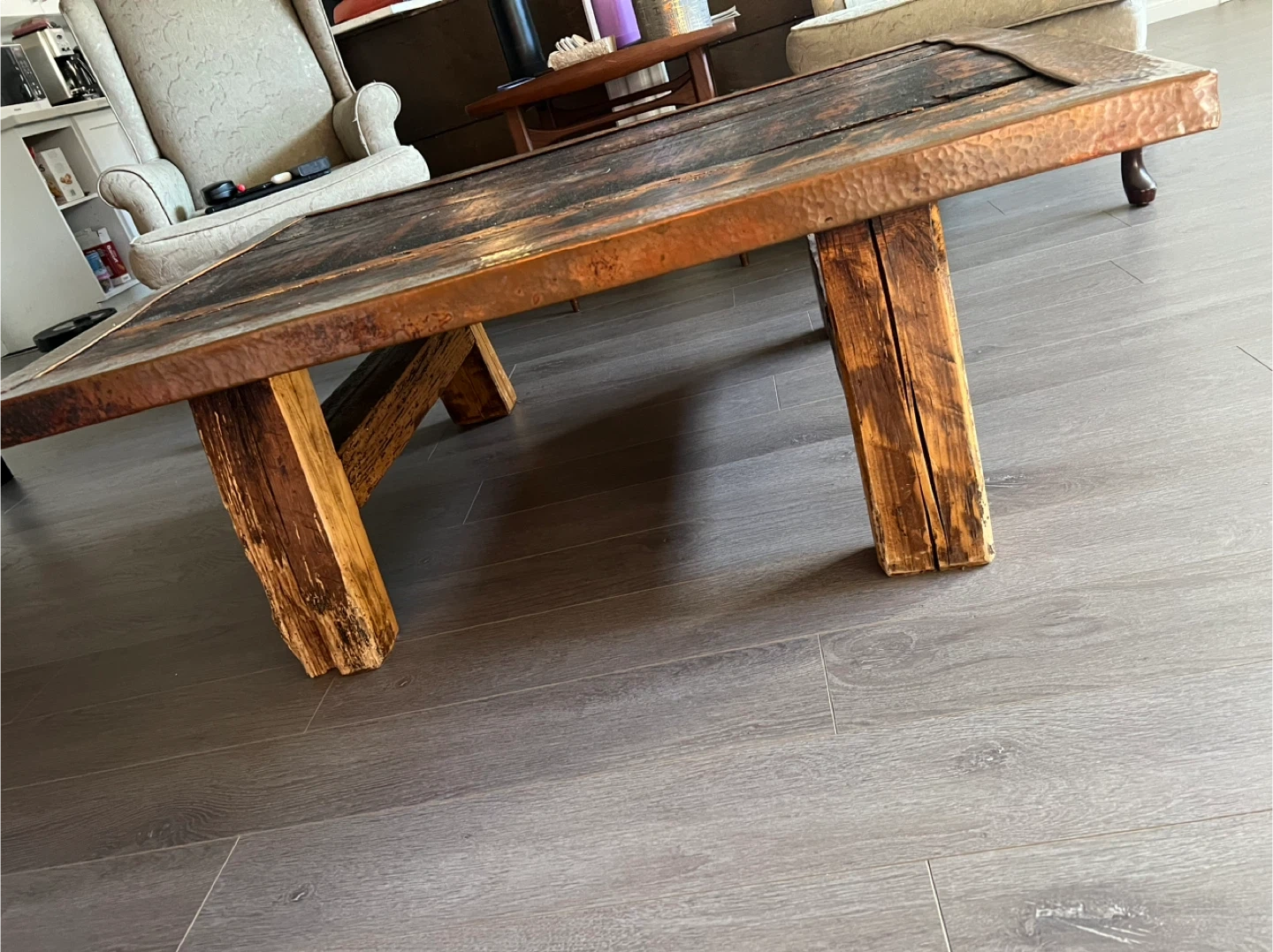 Selling a unique rustic coffee table. It features a dark wooden top with a copper-coloured metal trim and sturdy wooden legs. It would make a great addition to any living room! Hand made from original wood - original price - $1,000