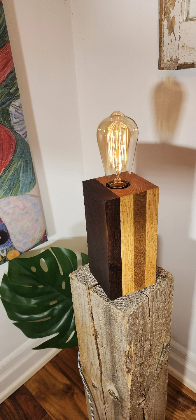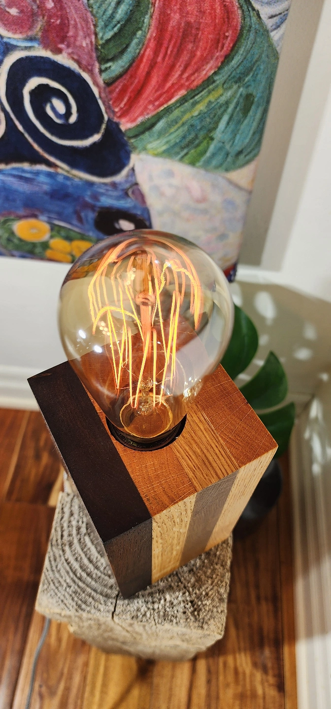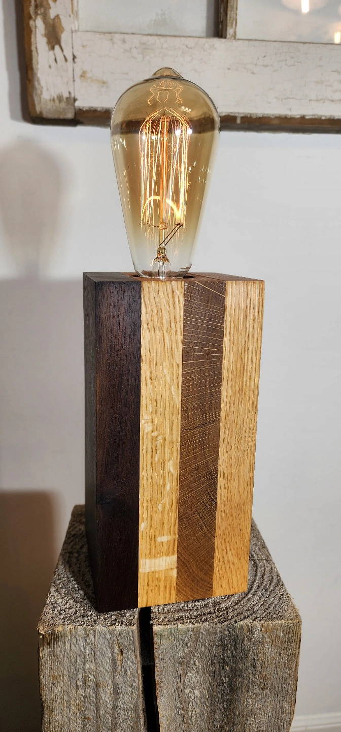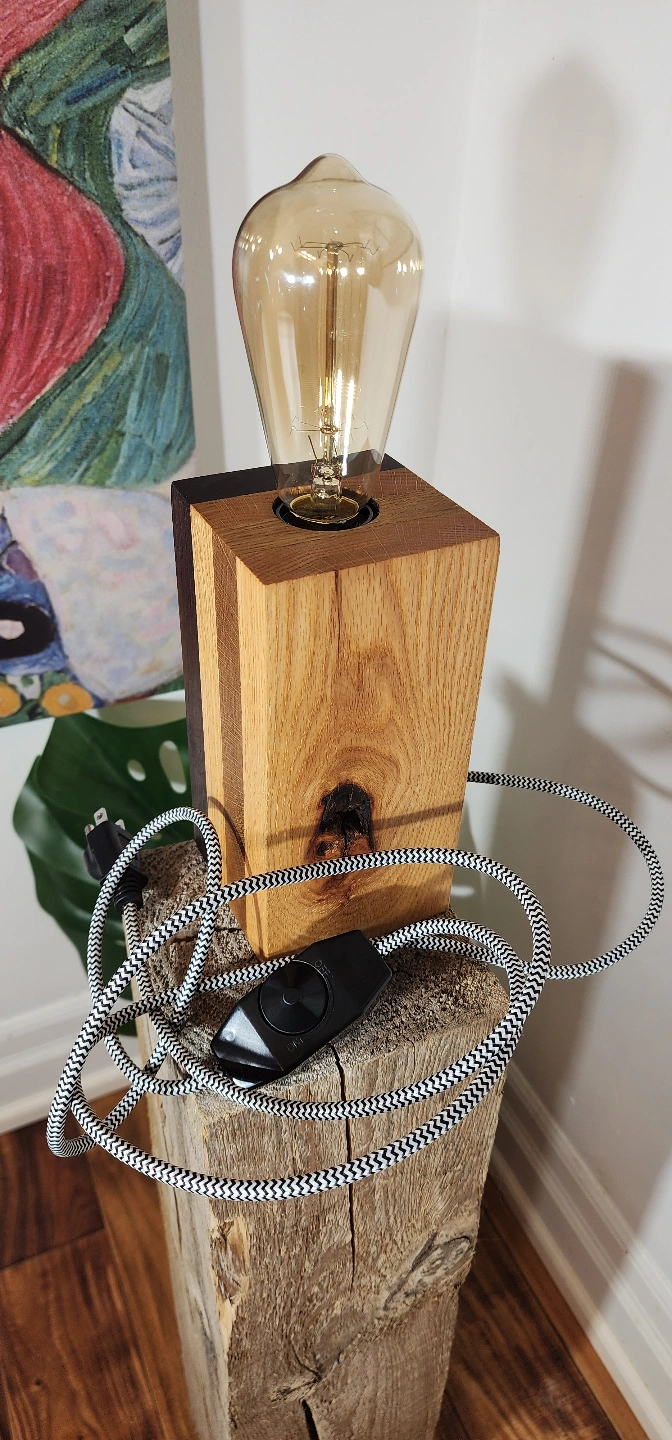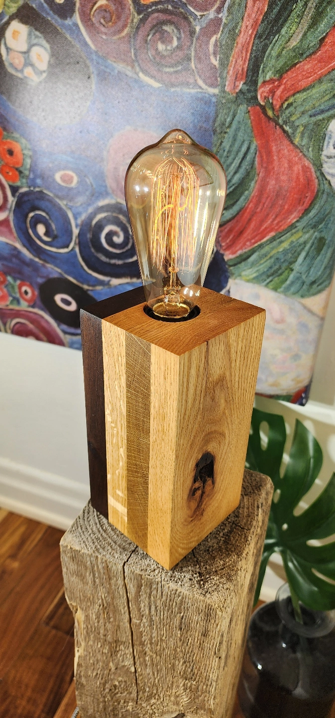 $80 Wood lamp Made from wood slaps joined together Dark wood Walnut, Beige Oak. Edison Light bulb, dimmer switch to balance the warm ambience on your home, office Store. Cloth wire for that retro touch. This piece will capture everyone's attention and enhance a modern classic look. Unique handcrafted lamp. Features a solid wood base and an Edison-style bulb. Adds a touch of rustic charm to any space. Simple design. Perfect bedside table lamp.