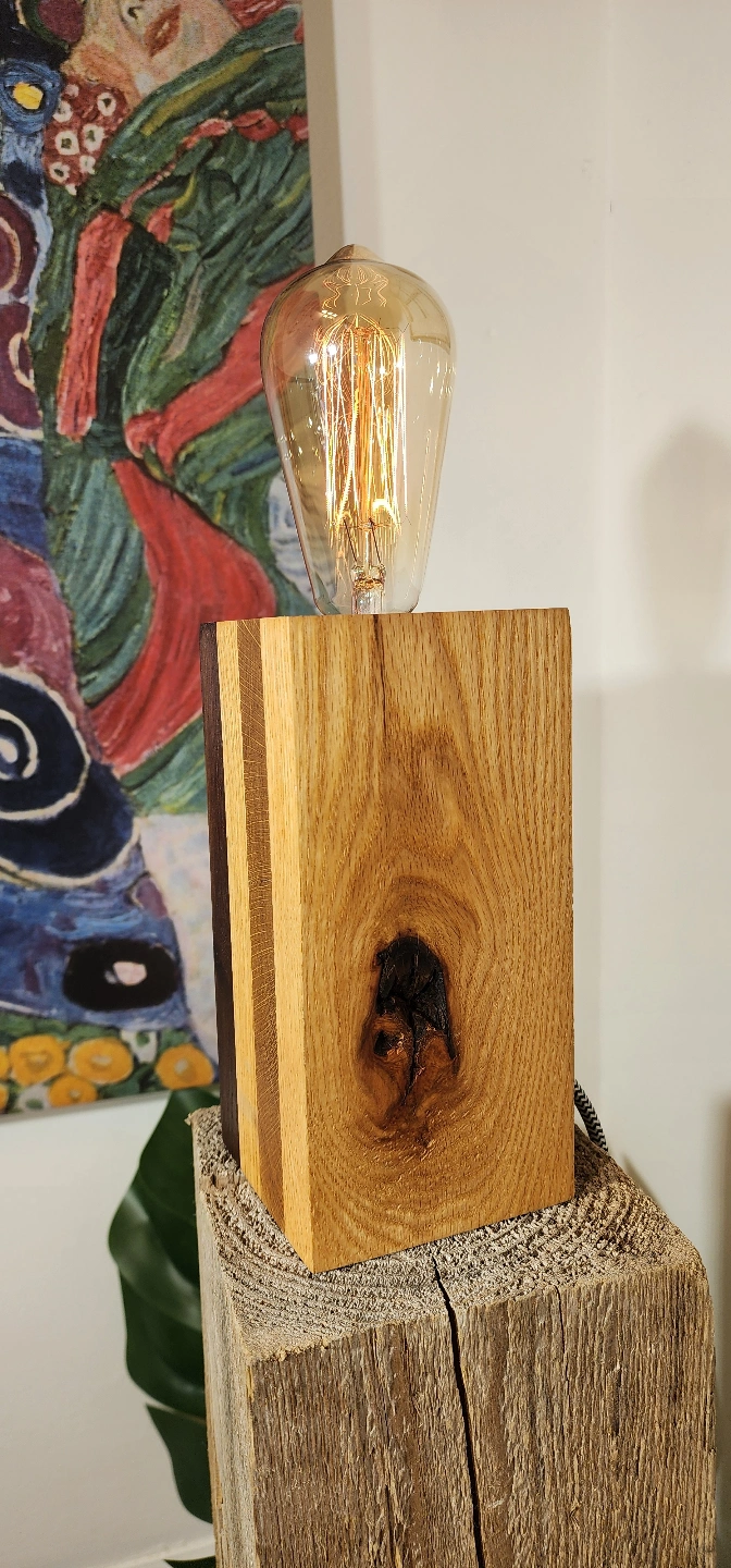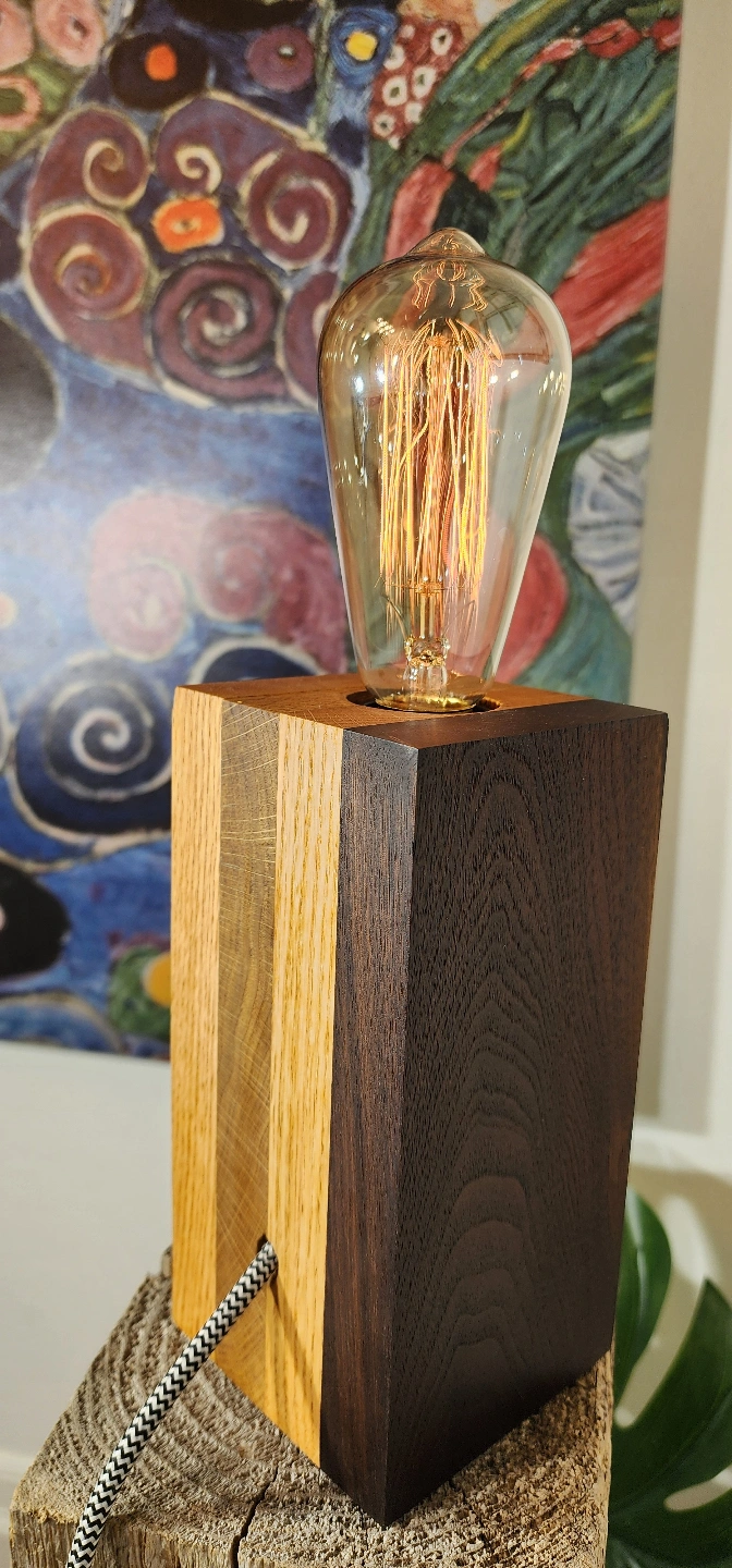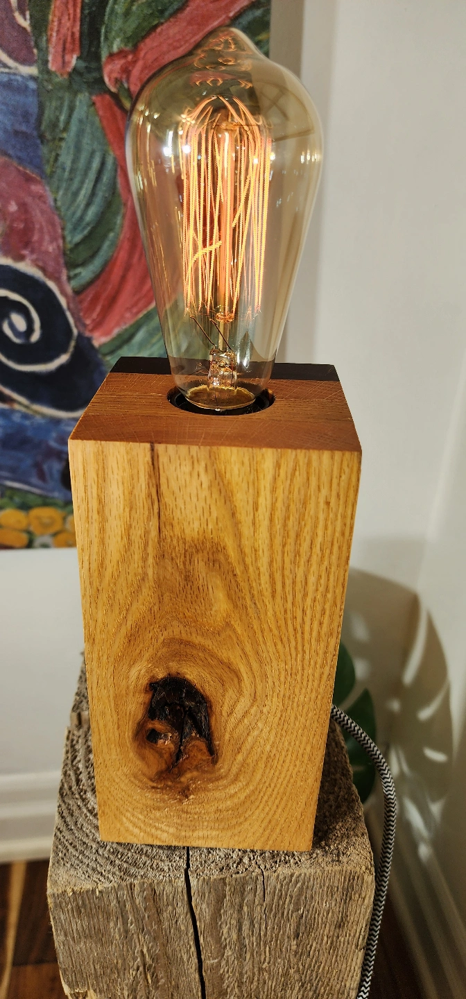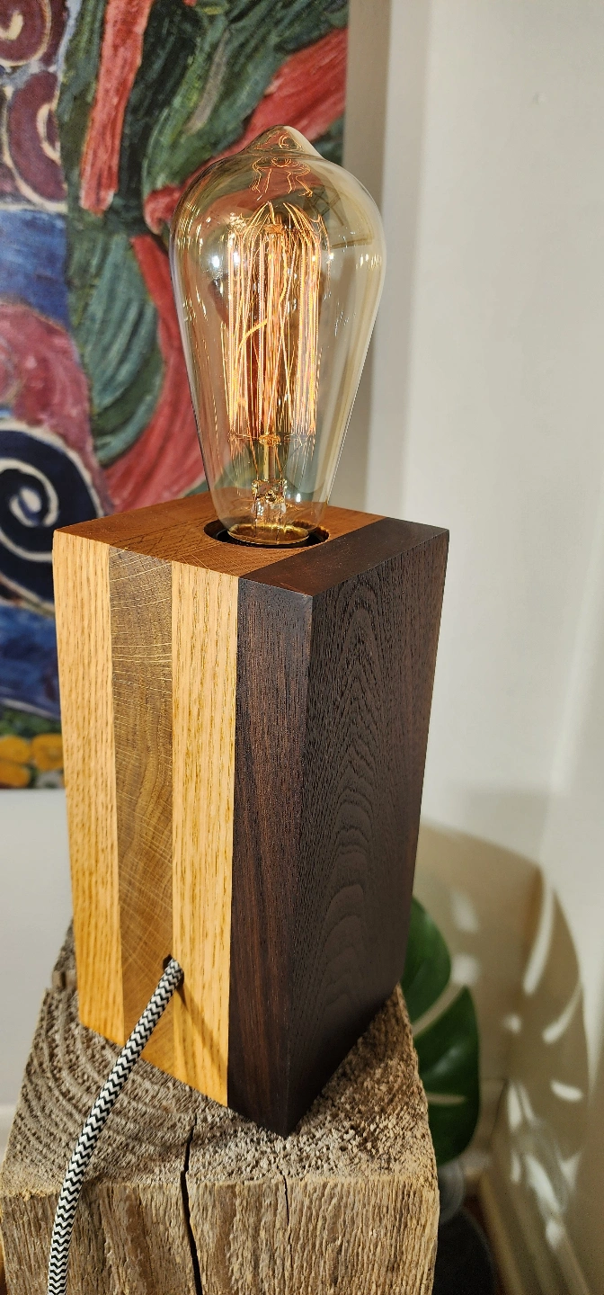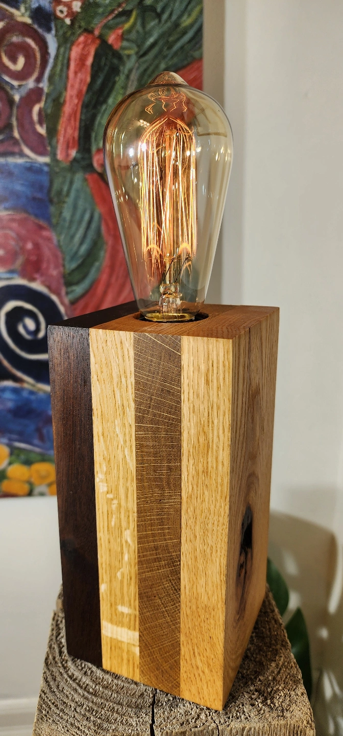$80 Wood lamp Made from wood slaps joined together Dark wood Walnut, Beige Oak. Edison Light bulb, dimmer switch to balance the warm ambience on your home, office Store. Cloth wire for that retro touch. This piece will capture everyone's attention and enhance a modern classic look. Unique handcrafted lamp. Features a solid wood base and an Edison-style bulb. Adds a touch of rustic charm to any space. Simple design. Perfect bedside table lamp.