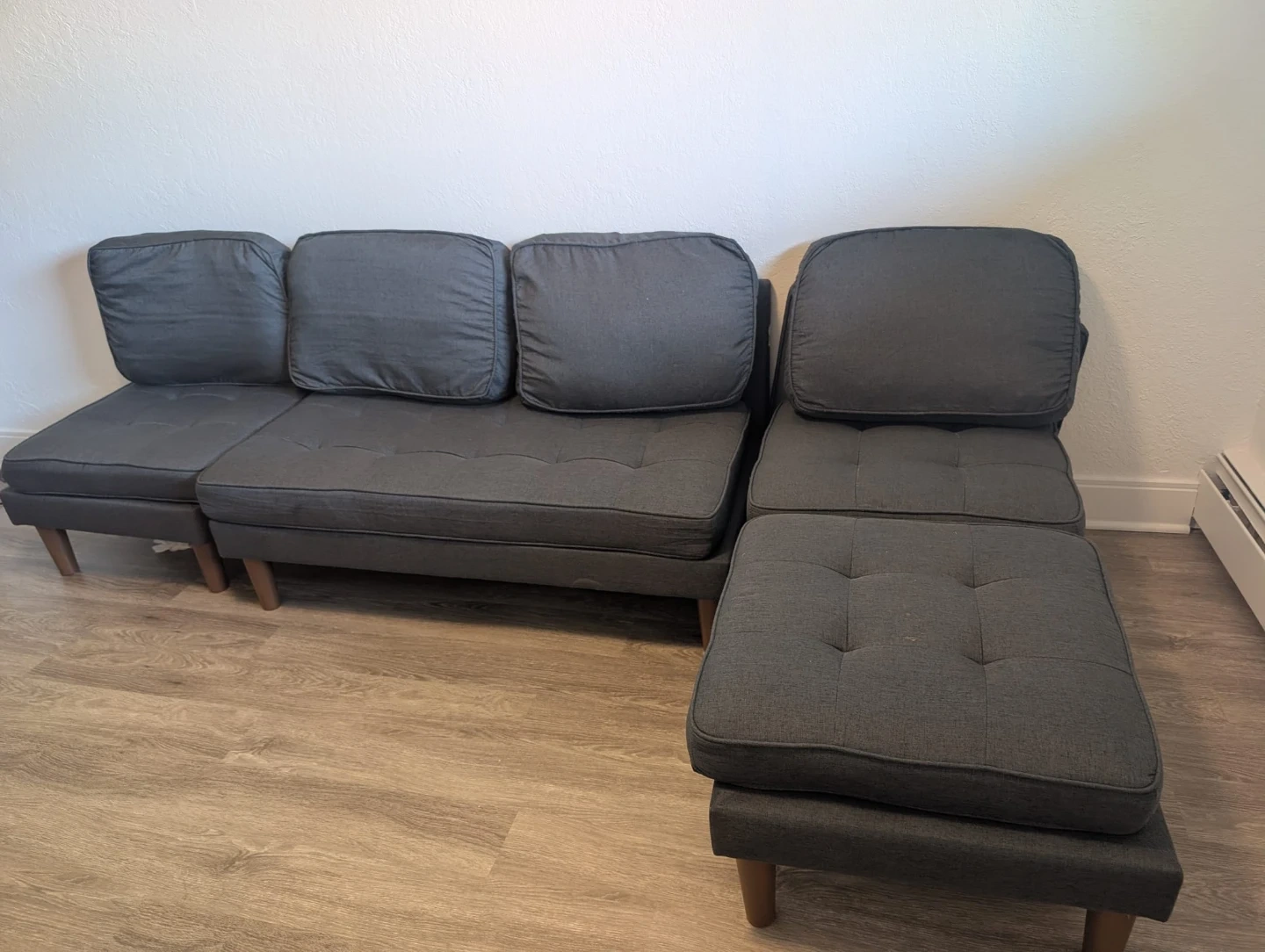 This sectional sofa is upholstered in a dark grey fabric with tufted seat cushions. It includes a matching ottoman that can be used as a footrest or extra seating. The modern design fits well in most living spaces. Can accomodate 4-5 people. Sorry, no delivery possible. Available for viewing.