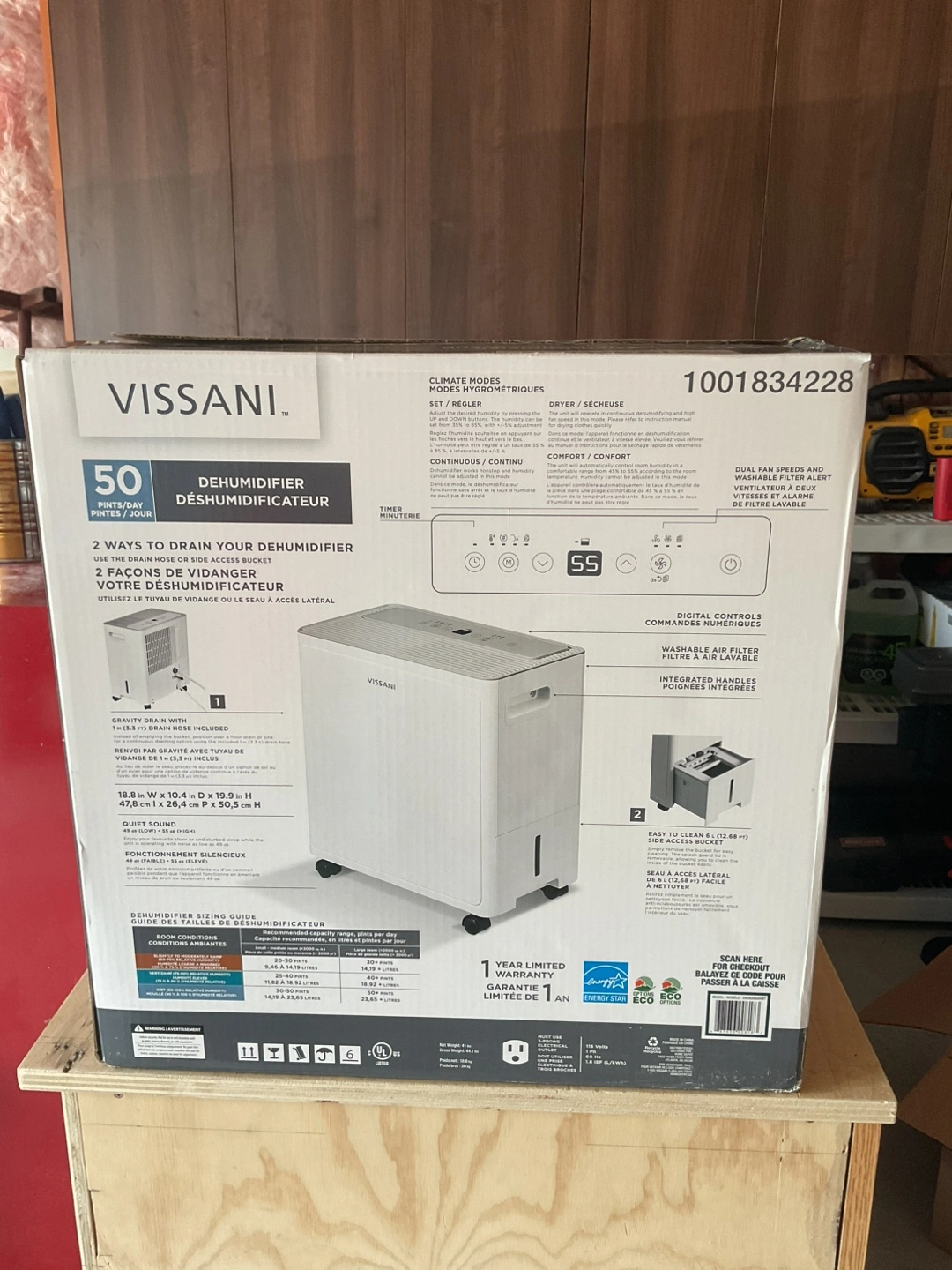 Selling a Vissani 50-pint dehumidifier! It's designed to handle high moisture and is perfect for damp areas. It features dual fan speeds and digital controls for easy use. The dehumidifier also has a washable air filter and integrated handles for portability. Plus, it comes with two ways to drain: a side access and a gravity drain with a hose included
