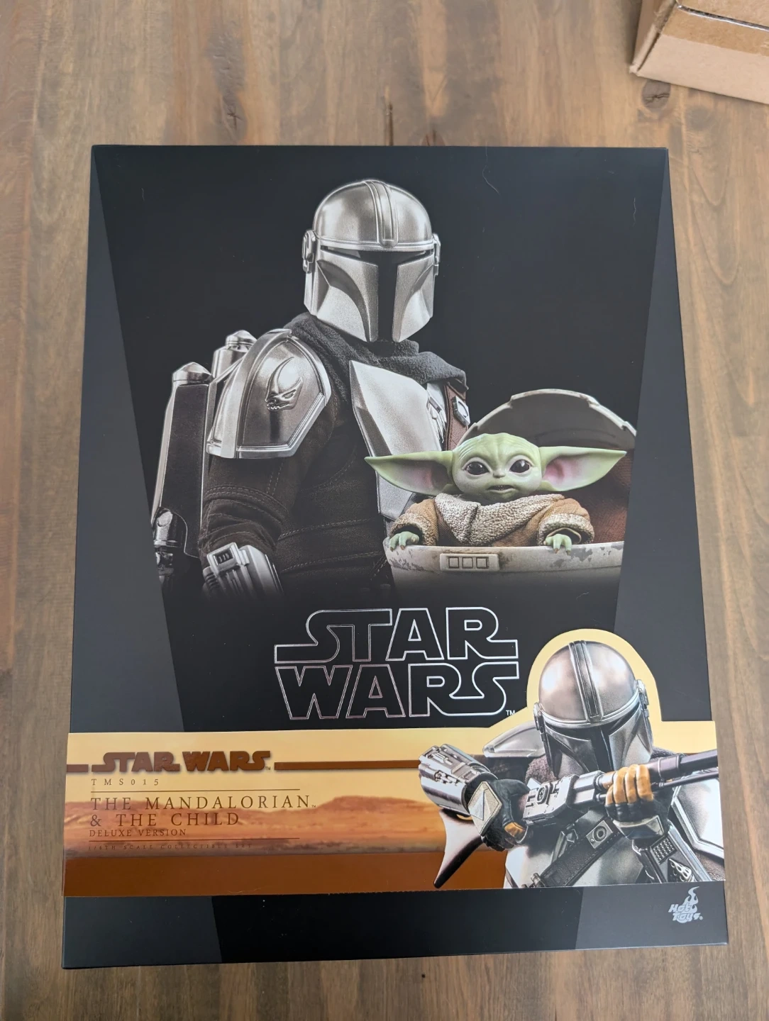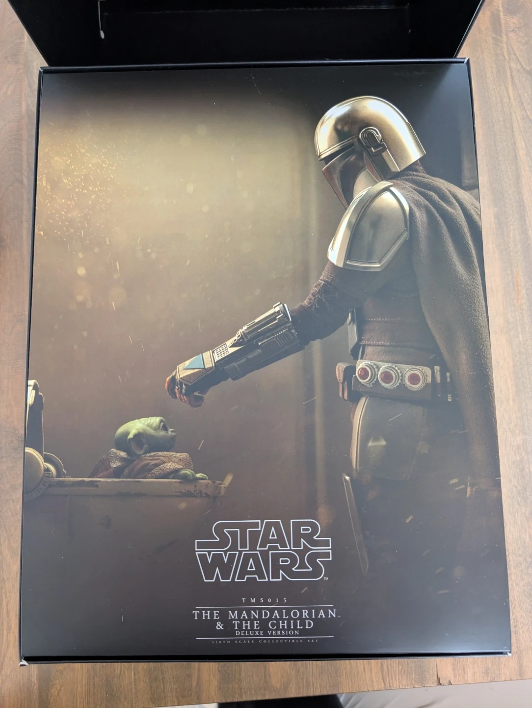 This is the Hot Toys 1:6 scale collectible figure set of The Mandalorian and The Child from Star Wars. It's the deluxe version and includes various accessories. The set comes with the main figure, The Child, and multiple interchangeable parts and weapons. Comes with original shipper box.