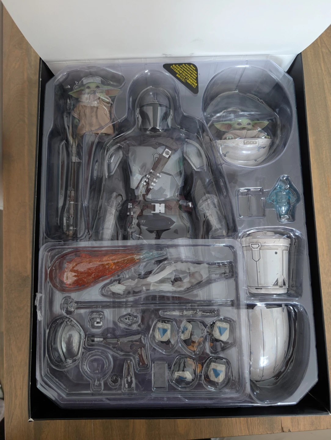This is the Hot Toys 1:6 scale collectible figure set of The Mandalorian and The Child from Star Wars. It's the deluxe version and includes various accessories. The set comes with the main figure, The Child, and multiple interchangeable parts and weapons. Comes with original shipper box.