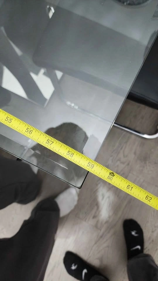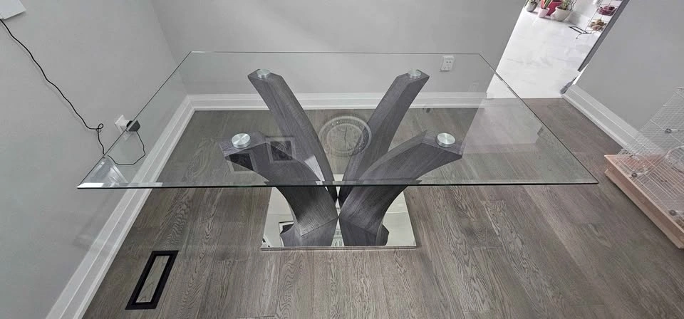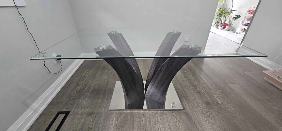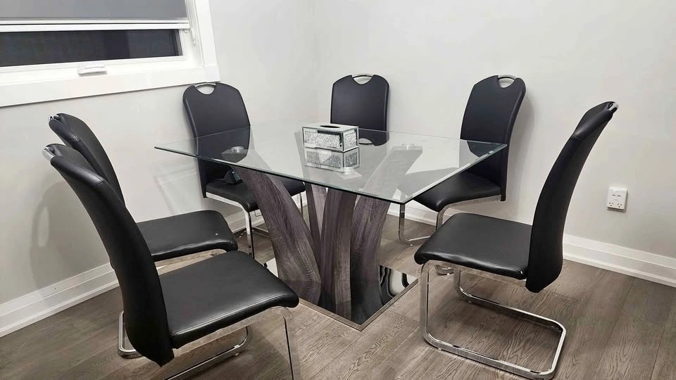 Glass dining table with chairs in excellent condition. Not used much. Glass on top and metal base. No issues at all and comes with 6 chairs. Can be dissassembled.
