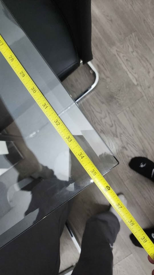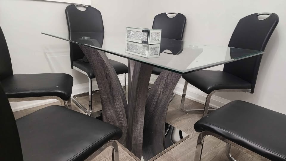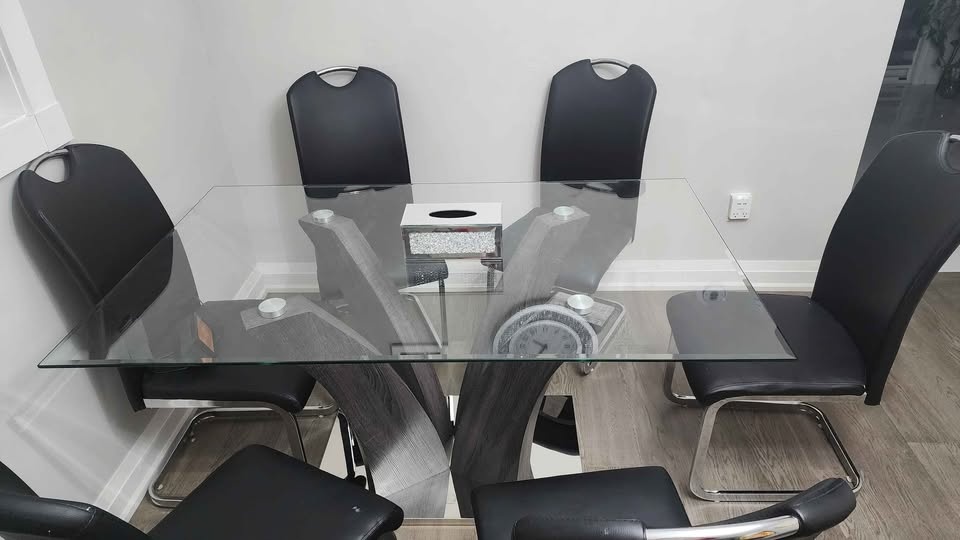 Glass dining table with chairs in excellent condition. Not used much. Glass on top and metal base. No issues at all and comes with 6 chairs. Can be dissassembled.
