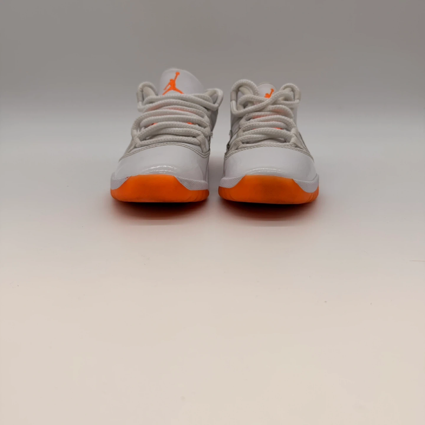 Authentic Nike Air Jordan 11 Retro Low GS sneakers in white with bright orange (citrus) outsole and accents.