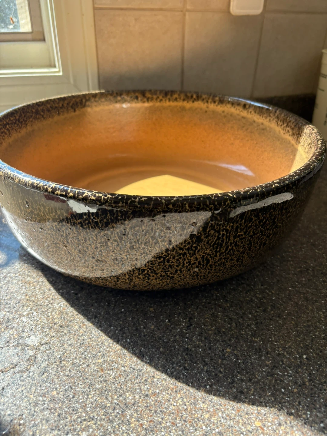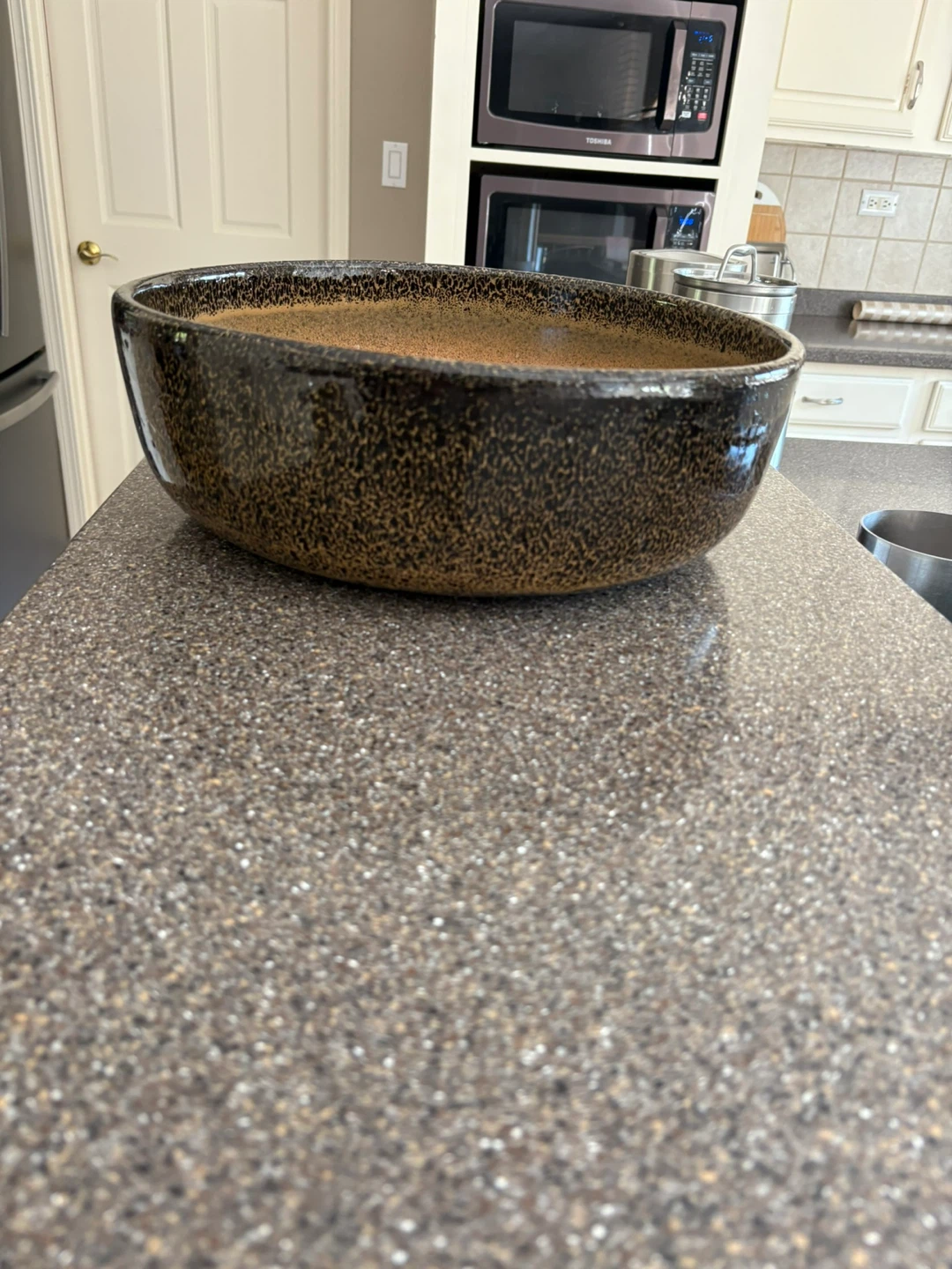 This is a large ceramic serving bowl with a speckled exterior and a glazed interior. It's perfect for salads, side dishes, or as a centerpiece. Dishwasher and microwave safe.