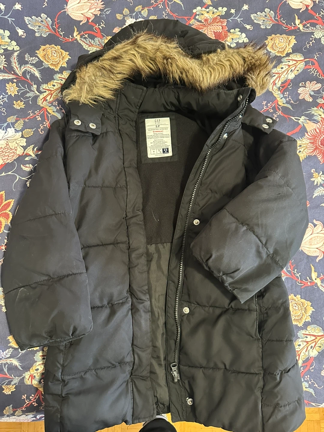This black GAP Kids puffer coat is designed for winter. It's a size S and features a cozy faux-fur lined hood. It's perfect for keeping warm during colder months!