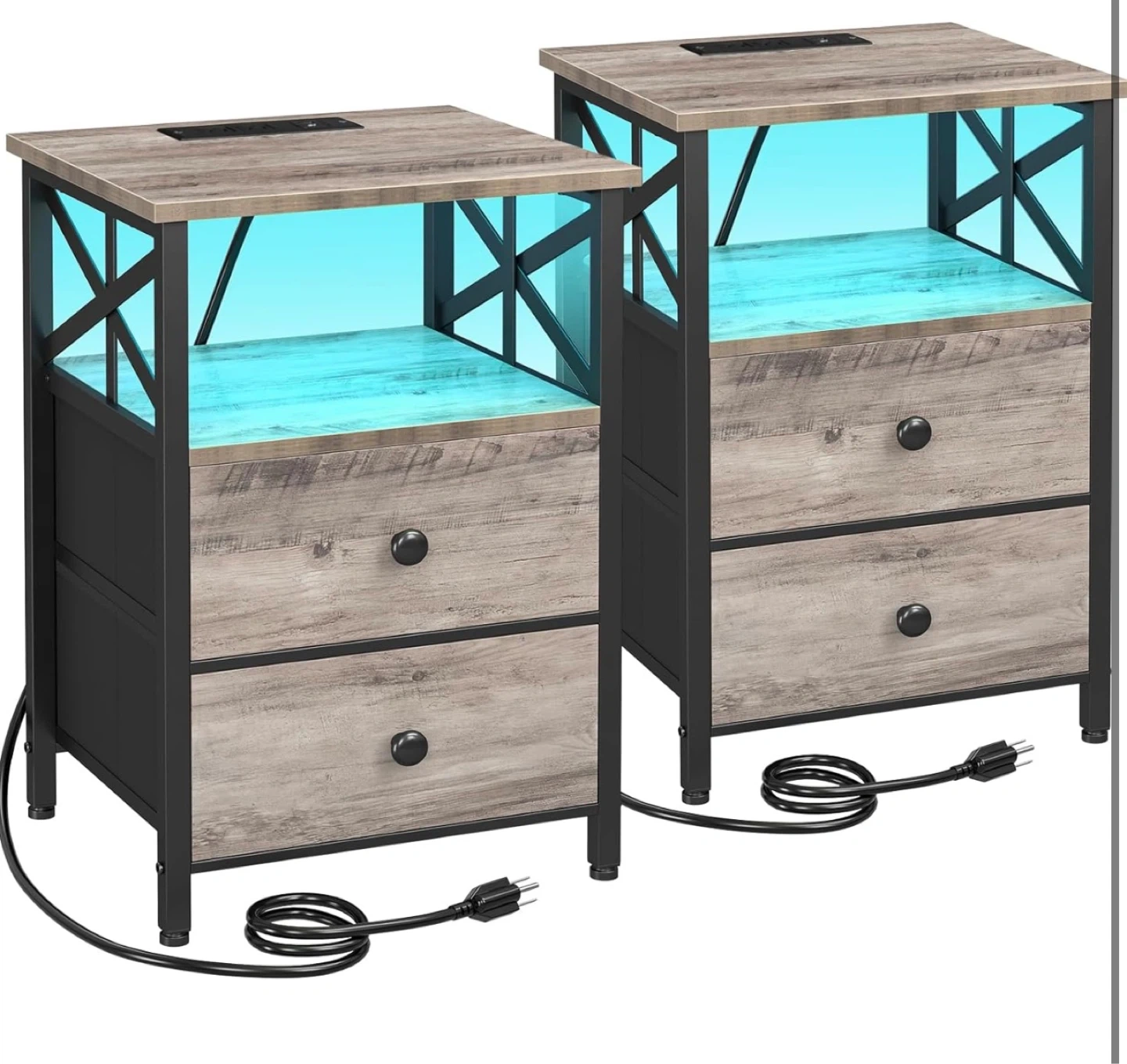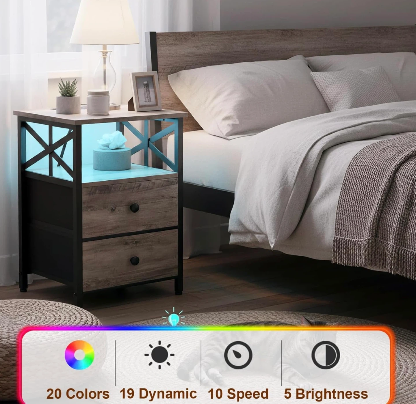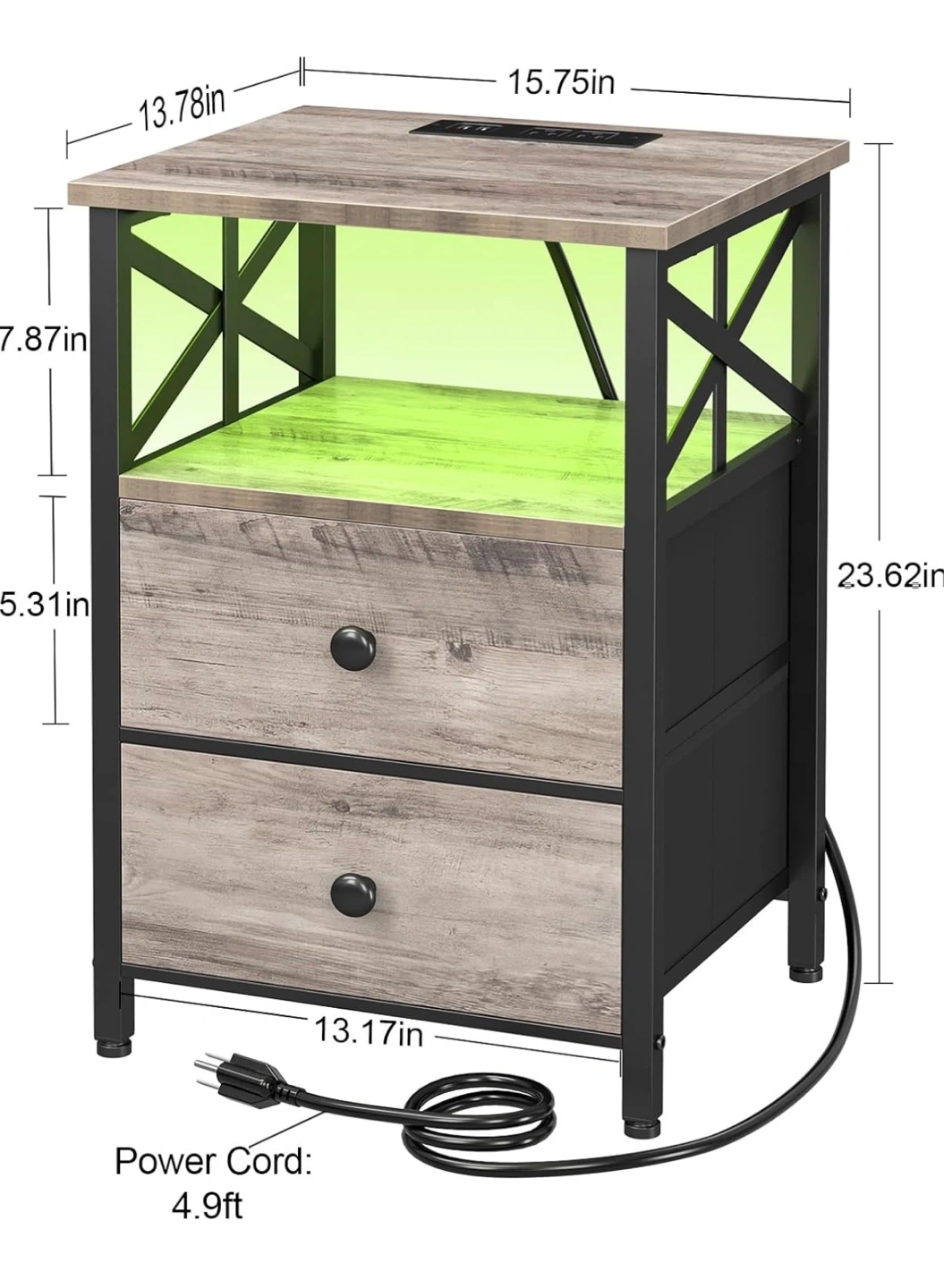 Two rustic wood-finish nightstands with black metal frames. Each unit features two drawers, a top shelf with integrated LED lighting, and a built-in charging station with 2 AC outlets, 1 USB port, and 1 Type-C port. Power cord length is 4.9ft. Overall dimensions: 15.75in L x 13.78in W x 23.62in H.