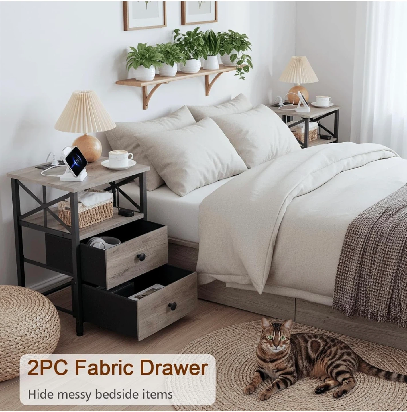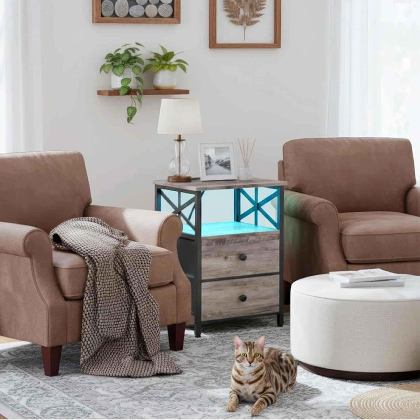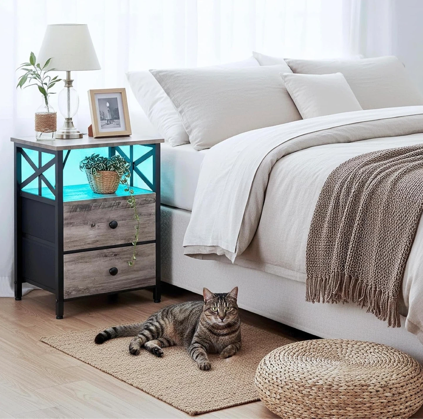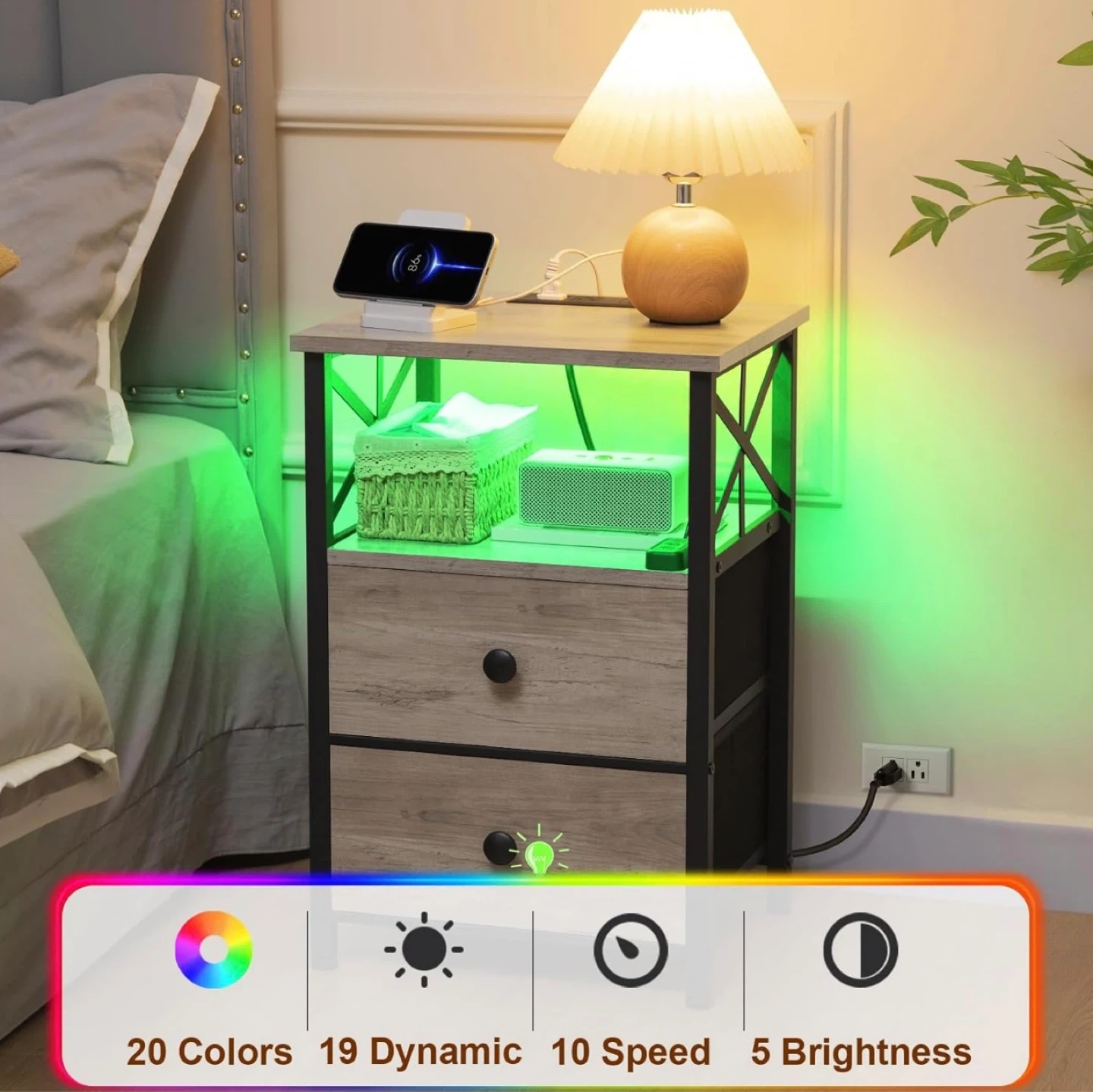 Two rustic wood-finish nightstands with black metal frames. Each unit features two drawers, a top shelf with integrated LED lighting, and a built-in charging station with 2 AC outlets, 1 USB port, and 1 Type-C port. Power cord length is 4.9ft. Overall dimensions: 15.75in L x 13.78in W x 23.62in H.