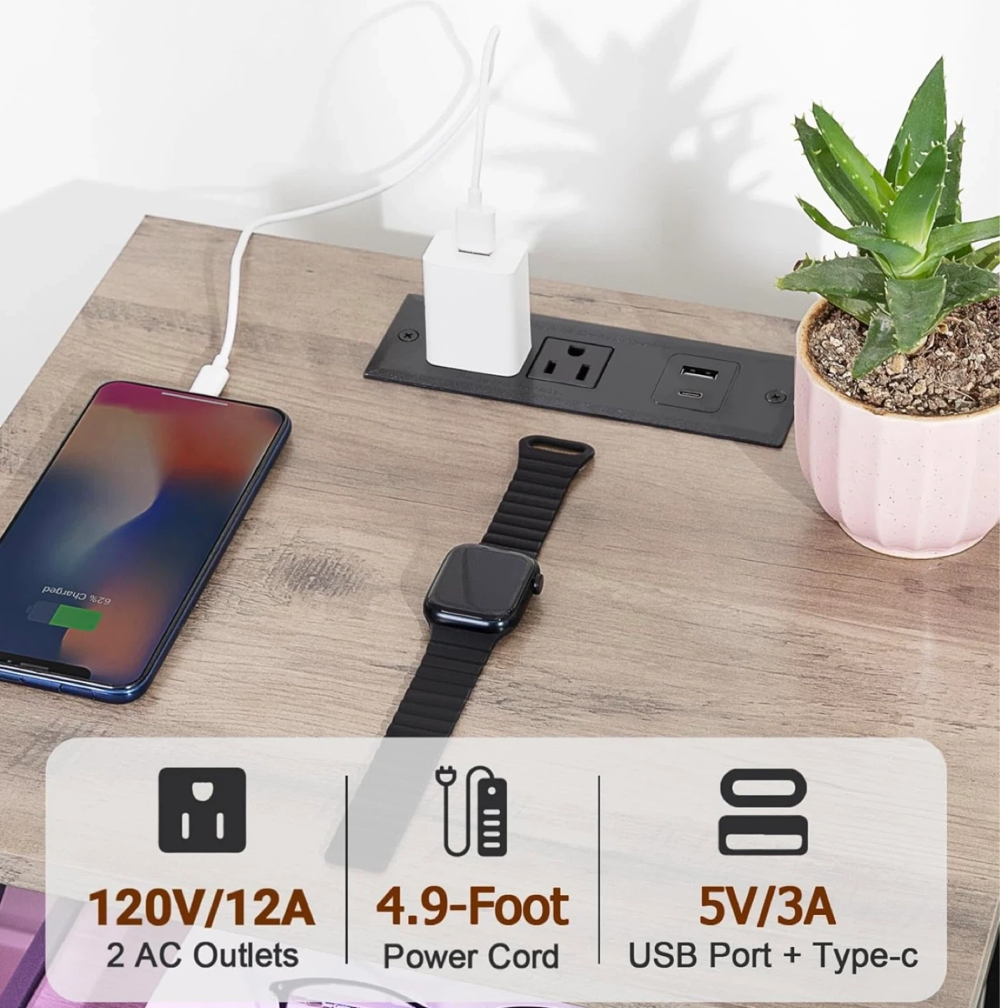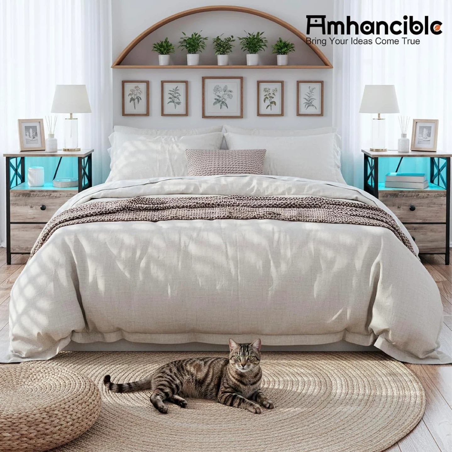 Two rustic wood-finish nightstands with black metal frames. Each unit features two drawers, a top shelf with integrated LED lighting, and a built-in charging station with 2 AC outlets, 1 USB port, and 1 Type-C port. Power cord length is 4.9ft. Overall dimensions: 15.75in L x 13.78in W x 23.62in H.