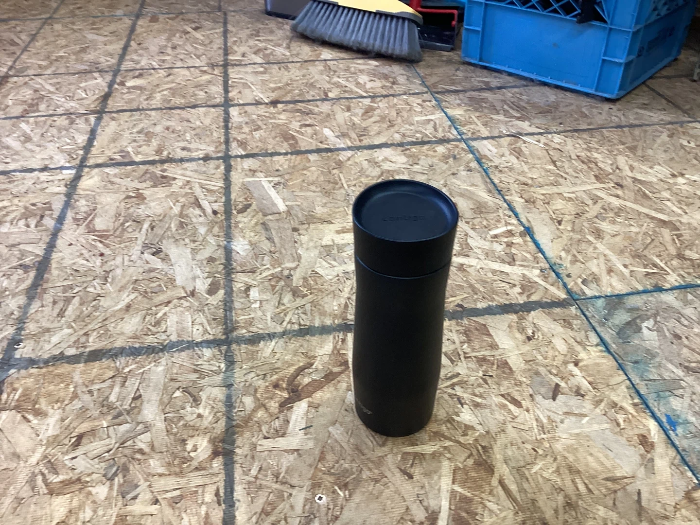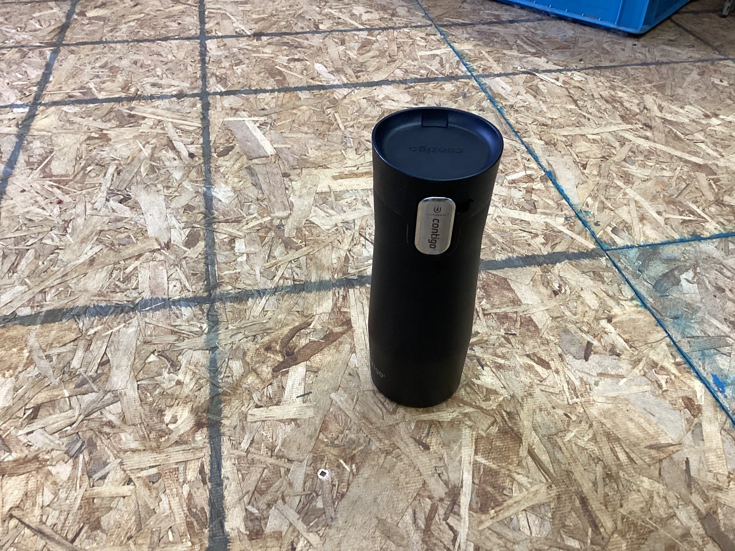 This black Contigo thermal tumbler keeps drinks hot or cold. It's made of stainless steel with a leak-proof lid. Great for on-the-go hydration!