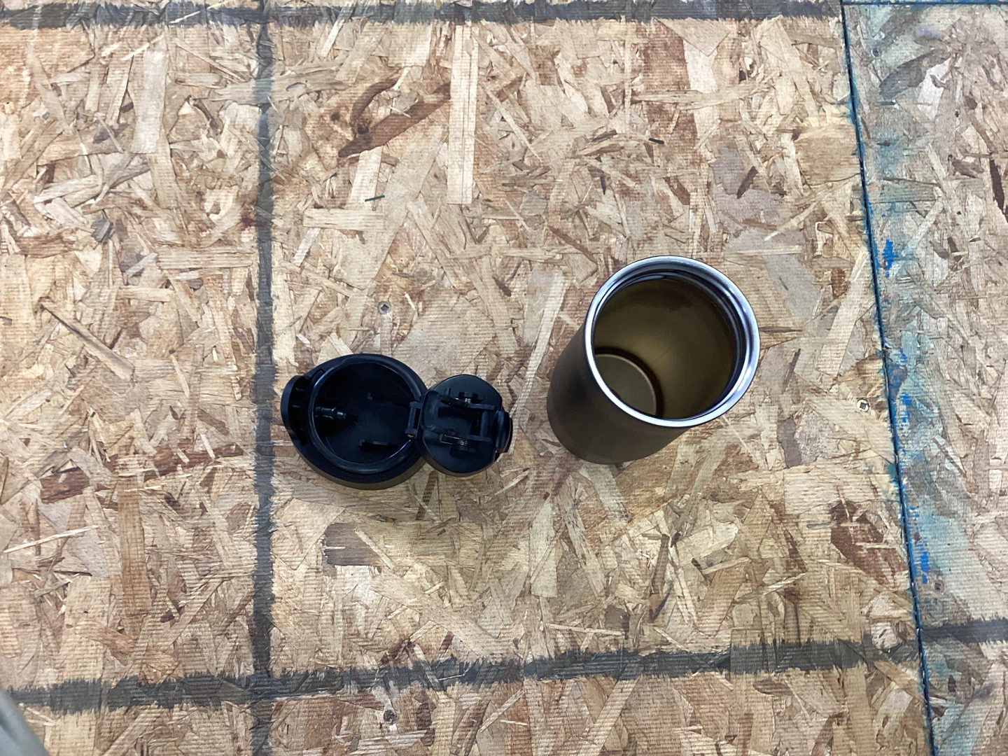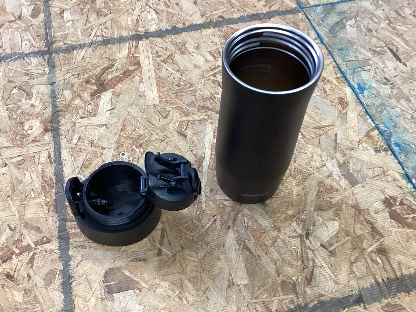 This black Contigo thermal tumbler keeps drinks hot or cold. It's made of stainless steel with a leak-proof lid. Great for on-the-go hydration!
