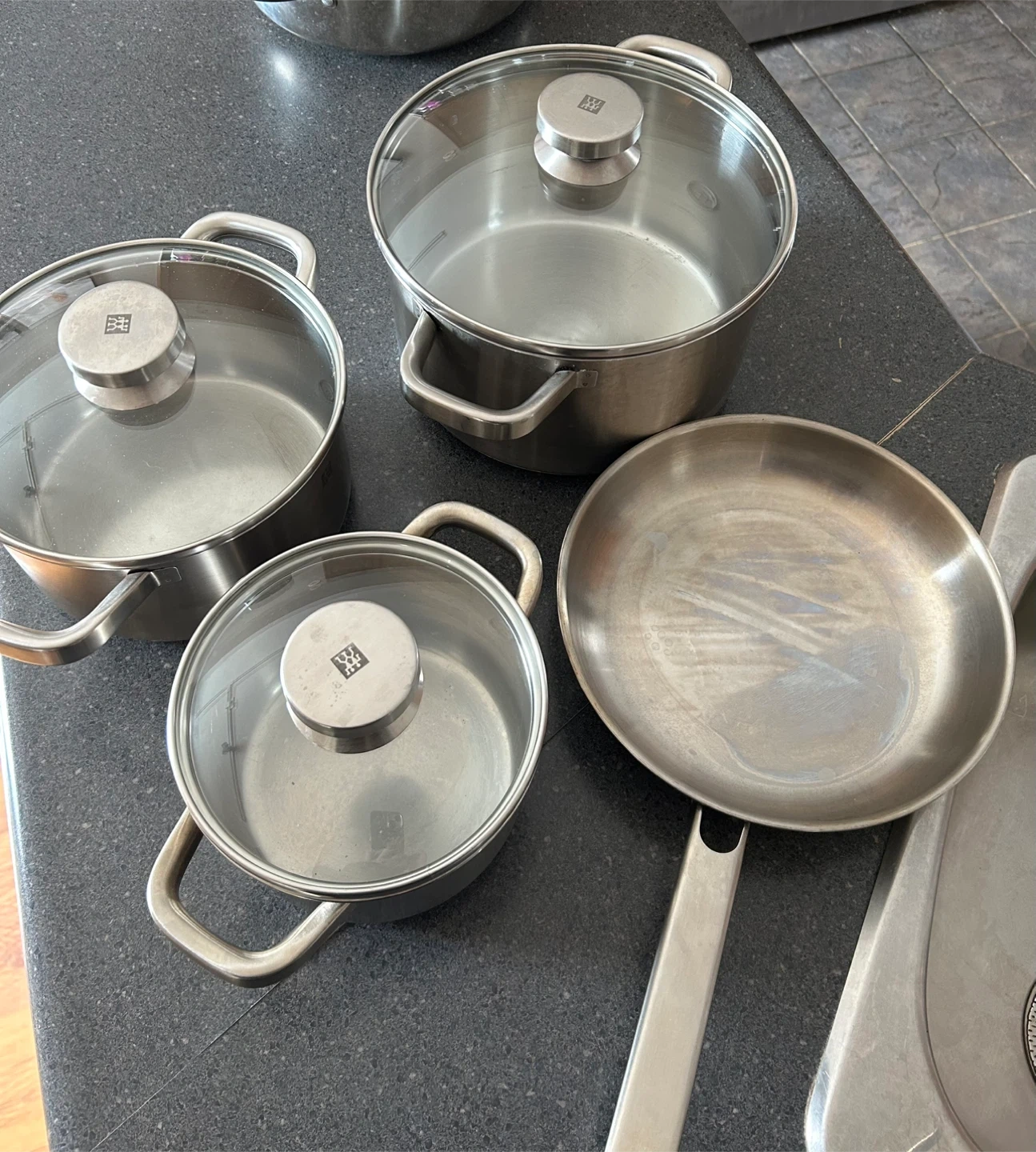 This is a set of Zwilling stainless steel pots and a frying pan. It includes a small pot with a lid, a medium pot with a lid, a large pot with a lid, and a frying pan. They're made from durable stainless steel with clear glass lids. This set is great for everyday cooking needs.