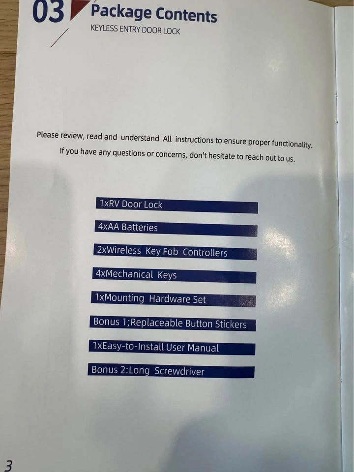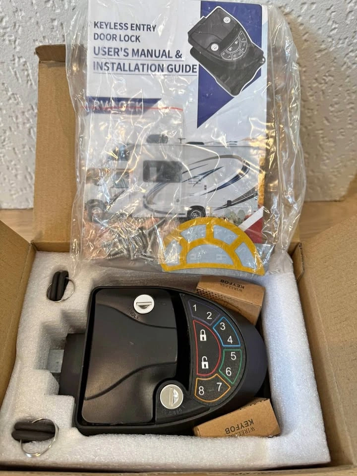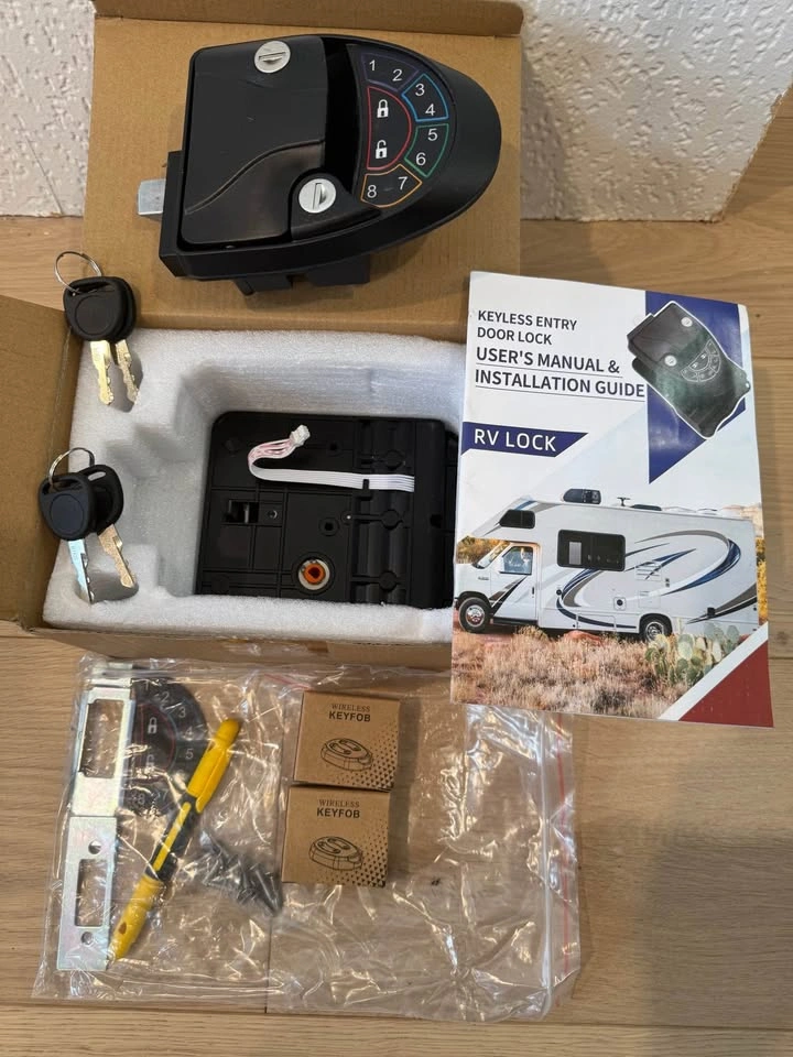 Brand new in box! RV Keyless Entry Door Lock with Remote Key, Zinc Alloy RV Trailer Door Lock Replacement with Latch Handle Knob Deadbolt & Keypad & Fob 20M/60Ft Door Lock Replacement for RV Trailer Camper Yacht Bus Bought for our RV, but it ended up being the wrong size and now past the return window. Dimensions in the photos. Includes: - RV Keyless door lock - 4 keys - 2 remote key fobs - Bonus replacement keypad sticker - Bonus long screwdriver No smoking/ no pet home Located on Middleton Mountain in Vernon FCFS - cash only due to etransfer scams