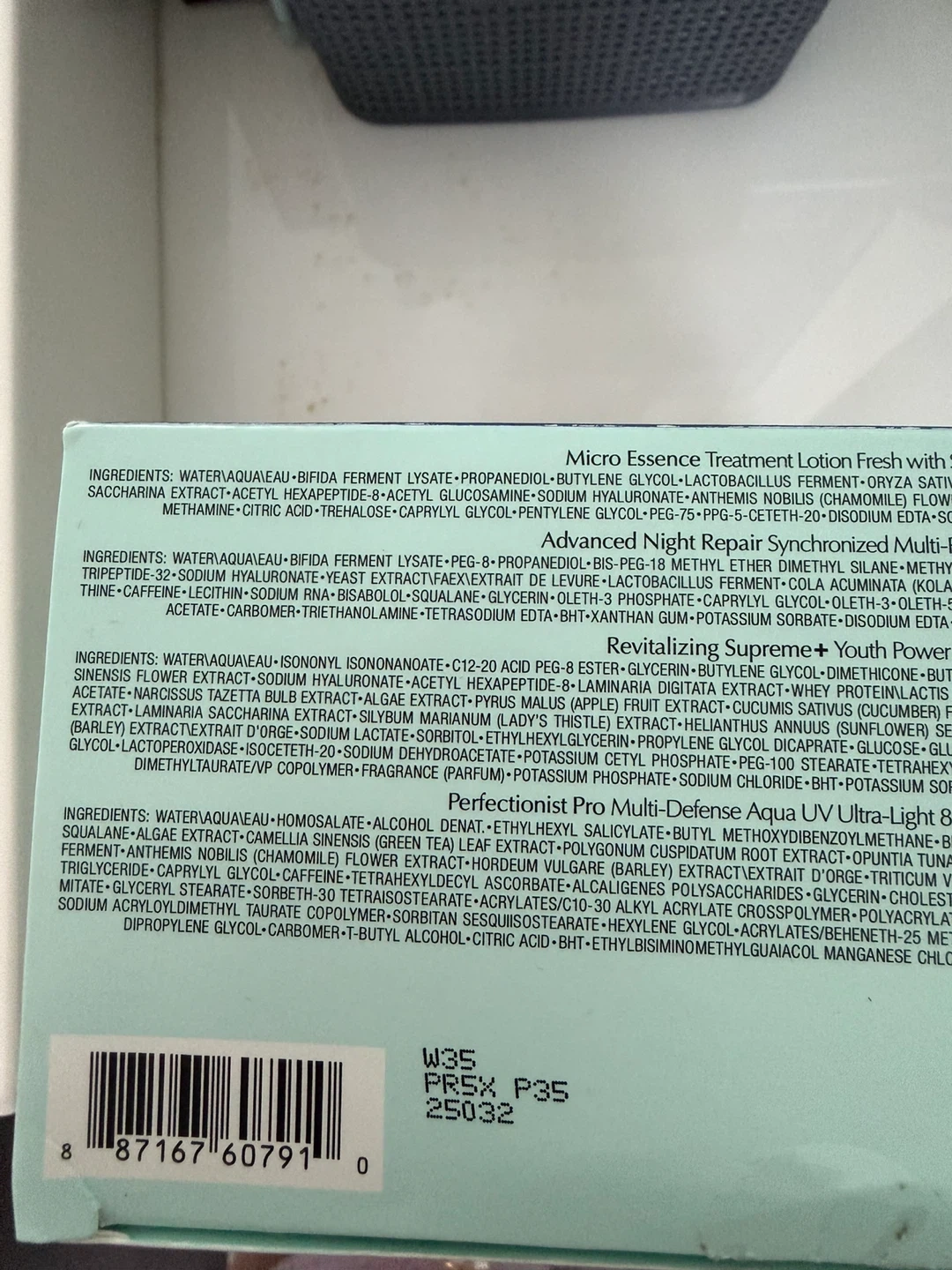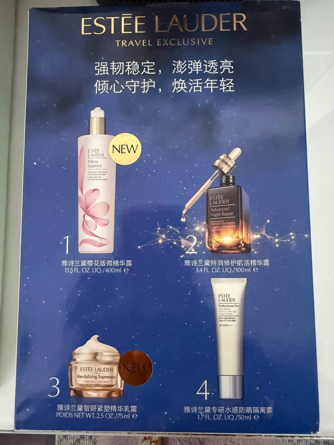 This Estée Lauder set includes Micro Essence Treatment Lotion (400ml), Advanced Night Repair Serum (100ml), Perfectionist Pro SPF 30 UV (50ml), and Revitalizing Supreme+ Cream (75ml). It's a complete skincare routine for rejuvenated skin.