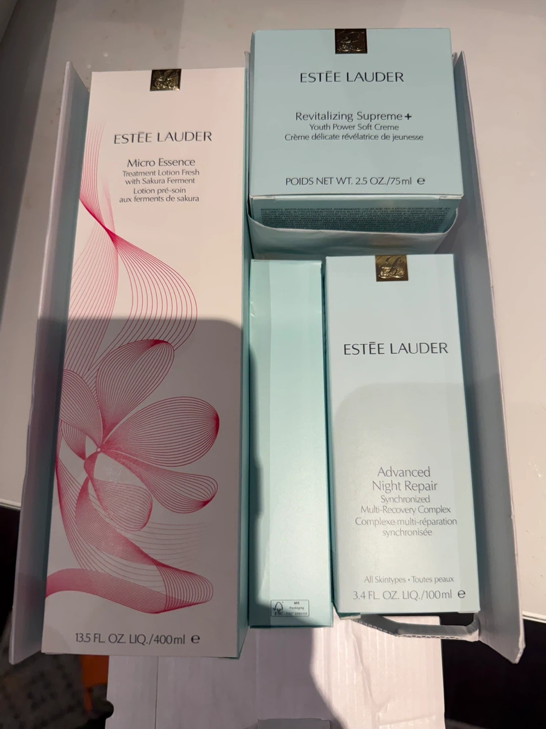 This Estée Lauder set includes Micro Essence Treatment Lotion (400ml), Advanced Night Repair Serum (100ml), Perfectionist Pro SPF 30 UV (50ml), and Revitalizing Supreme+ Cream (75ml). It's a complete skincare routine for rejuvenated skin.
