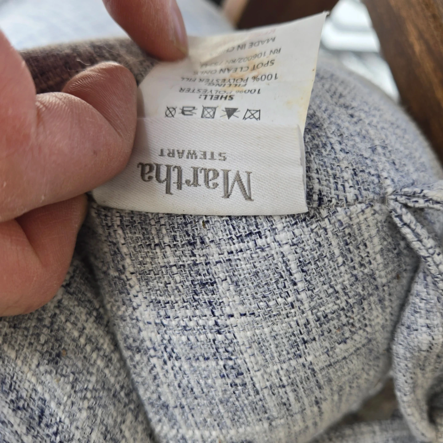 Also comes with 2 Martha Stuart large outdoor seat cushions. 1 string of the cushion was detached. Its still there if u want to sew it on. 1 button on the cushion went missing so a new button was sewn in.