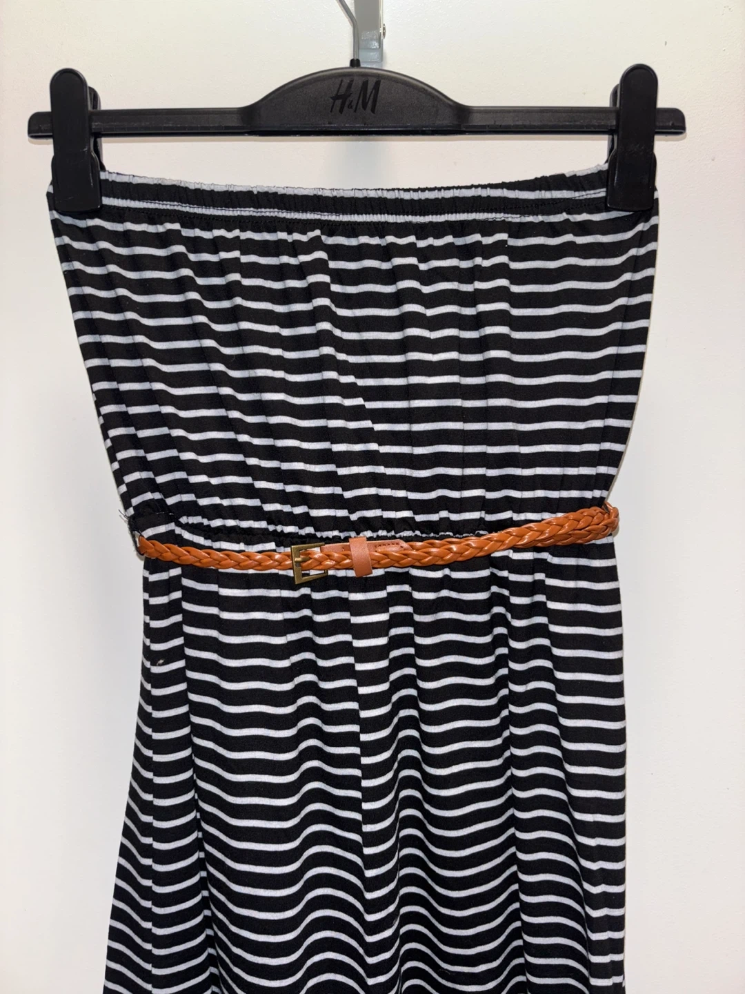 This strapless maxi dress features a black and white stripe pattern. It includes a braided tan belt at the waist. Dress is made from a soft, stretchy material. Size large. Brand new.