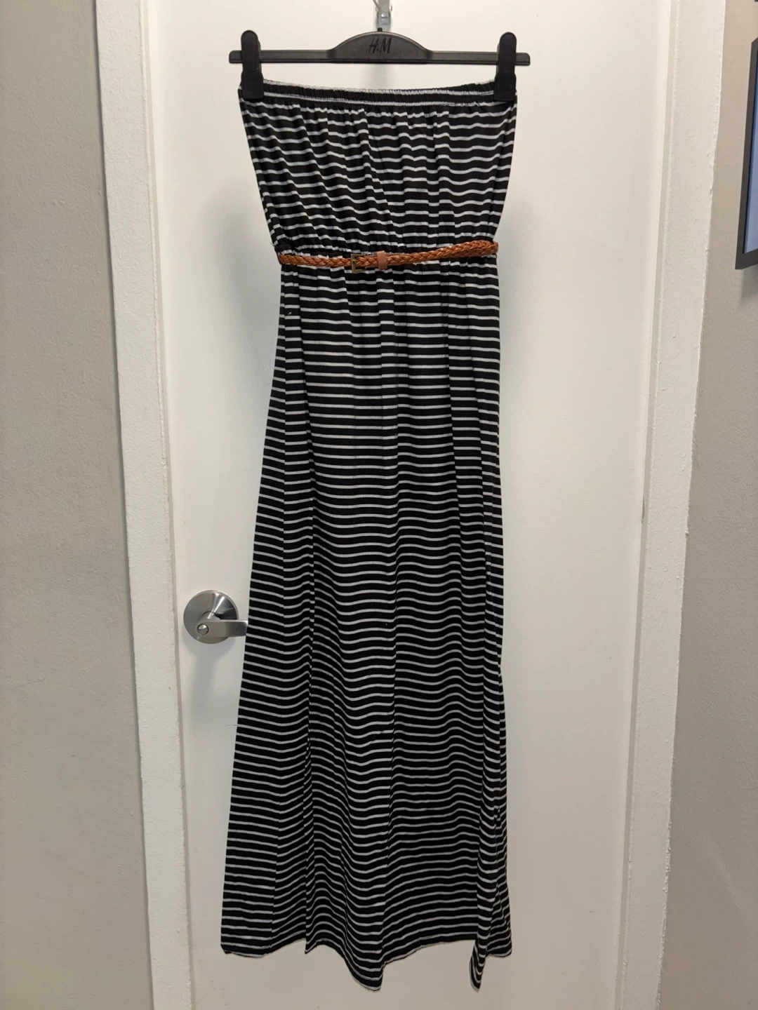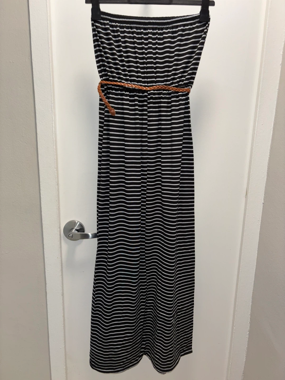 This strapless maxi dress features a black and white stripe pattern. It includes a braided tan belt at the waist. Dress is made from a soft, stretchy material. Size large. Brand new.