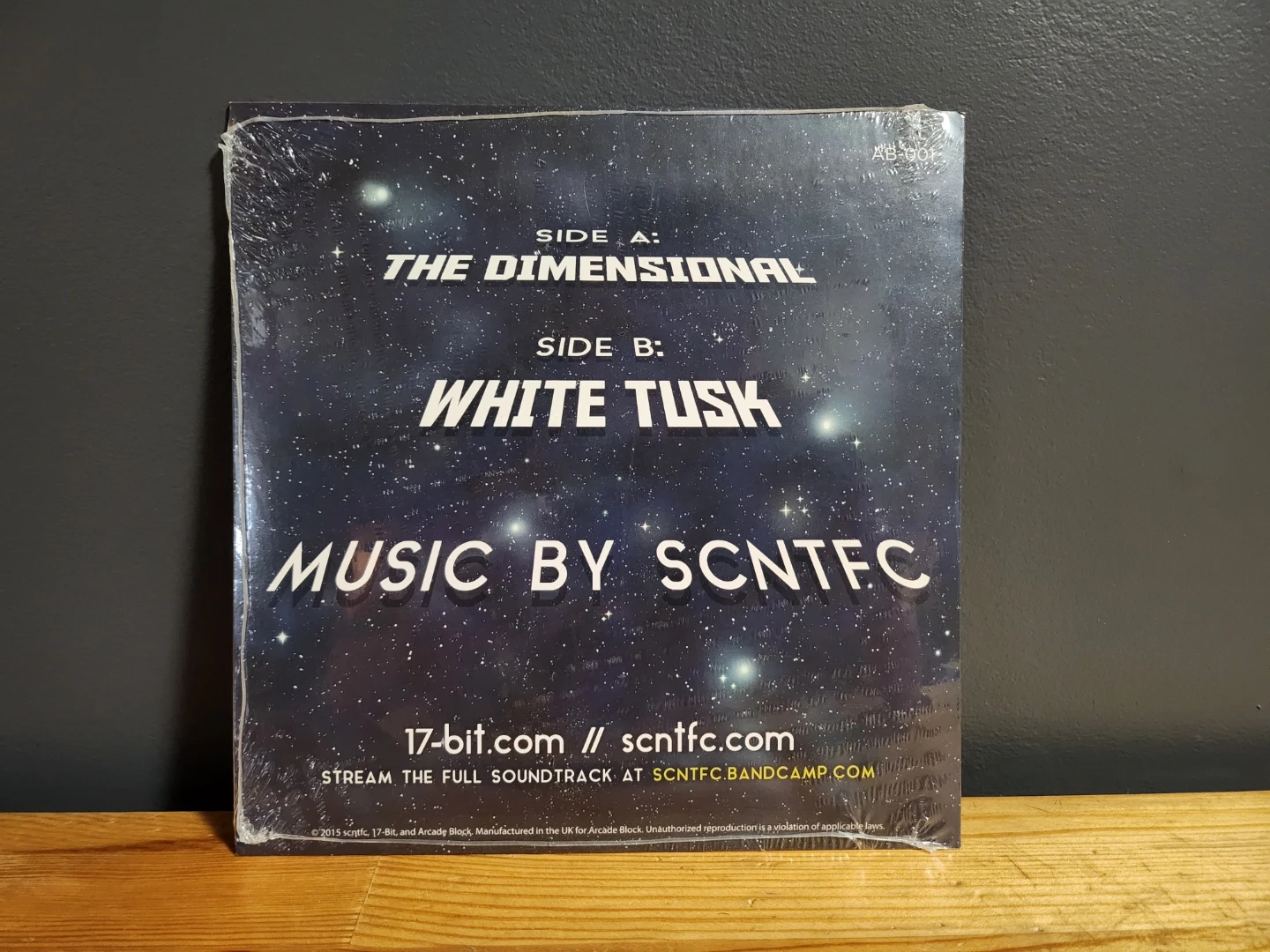 Galak-Z: The Dimensional soundtrack, specifically a limited edition 7" vinyl single presented by Arcade Block. The soundtrack features music by scntfc and includes the tracks "The Dimensional" and "White Tusk". The record was an exclusive collectible item included in the September 2015 Arcade Block subscription box.