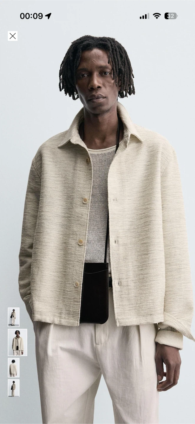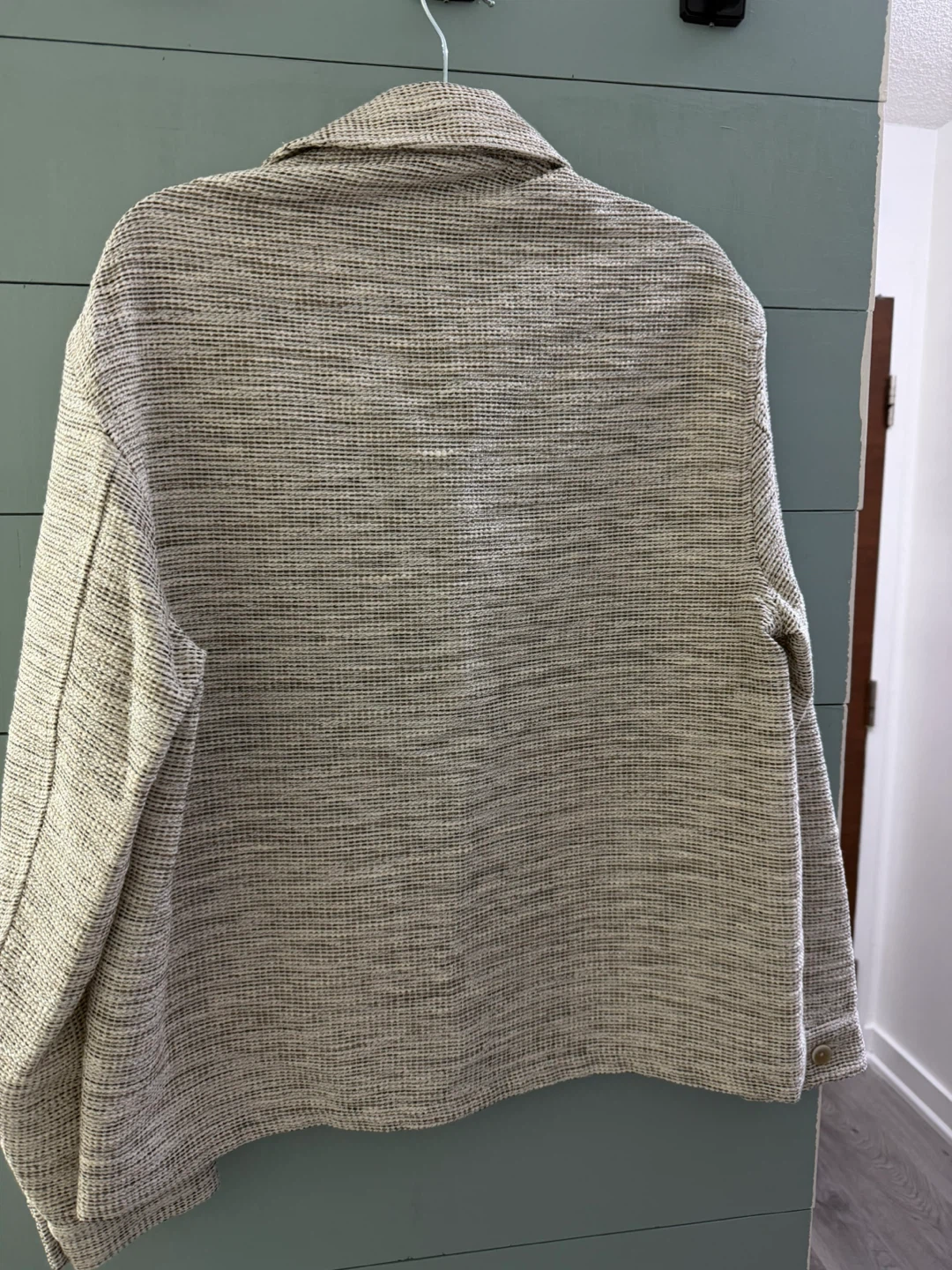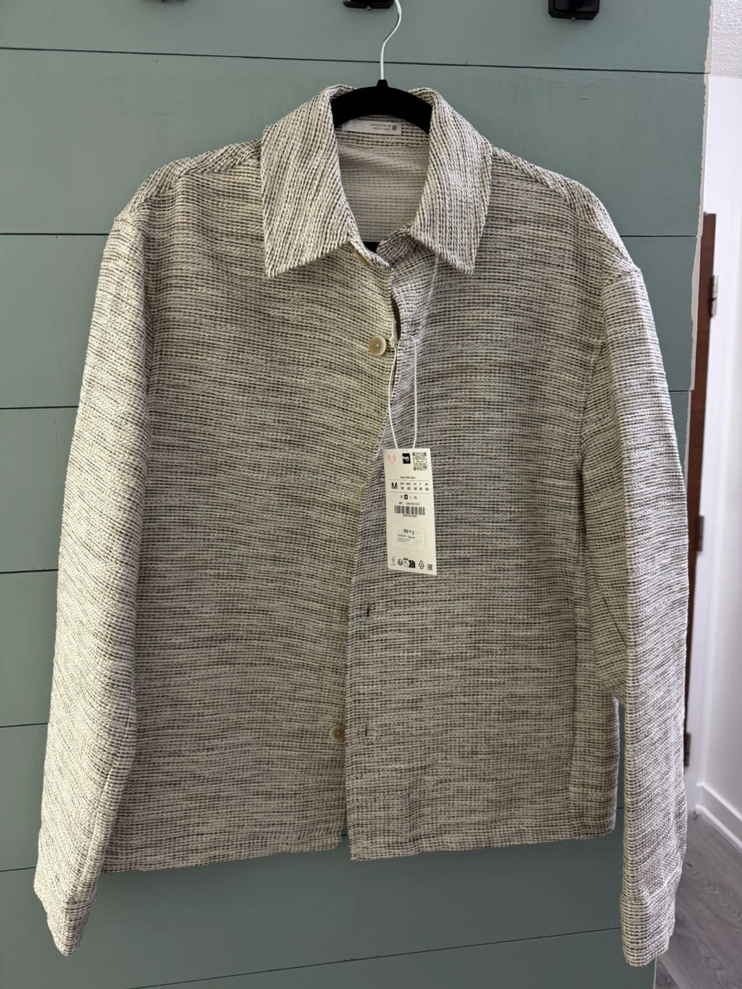 Zara textured overshirt in a neutral cream and grey weave. It's a size medium with button-up front and a classic collar. This shirt works for layering in cooler weather.