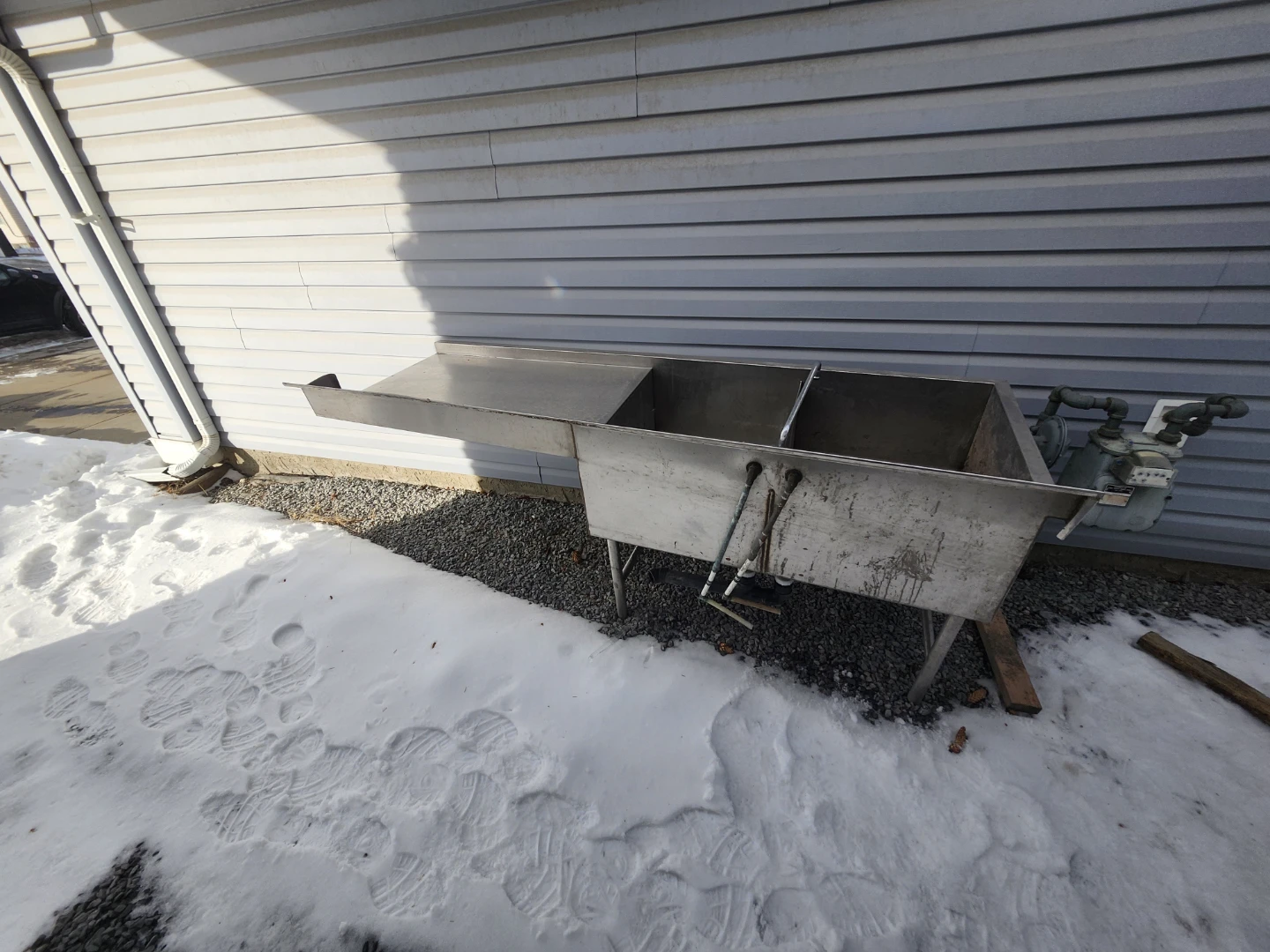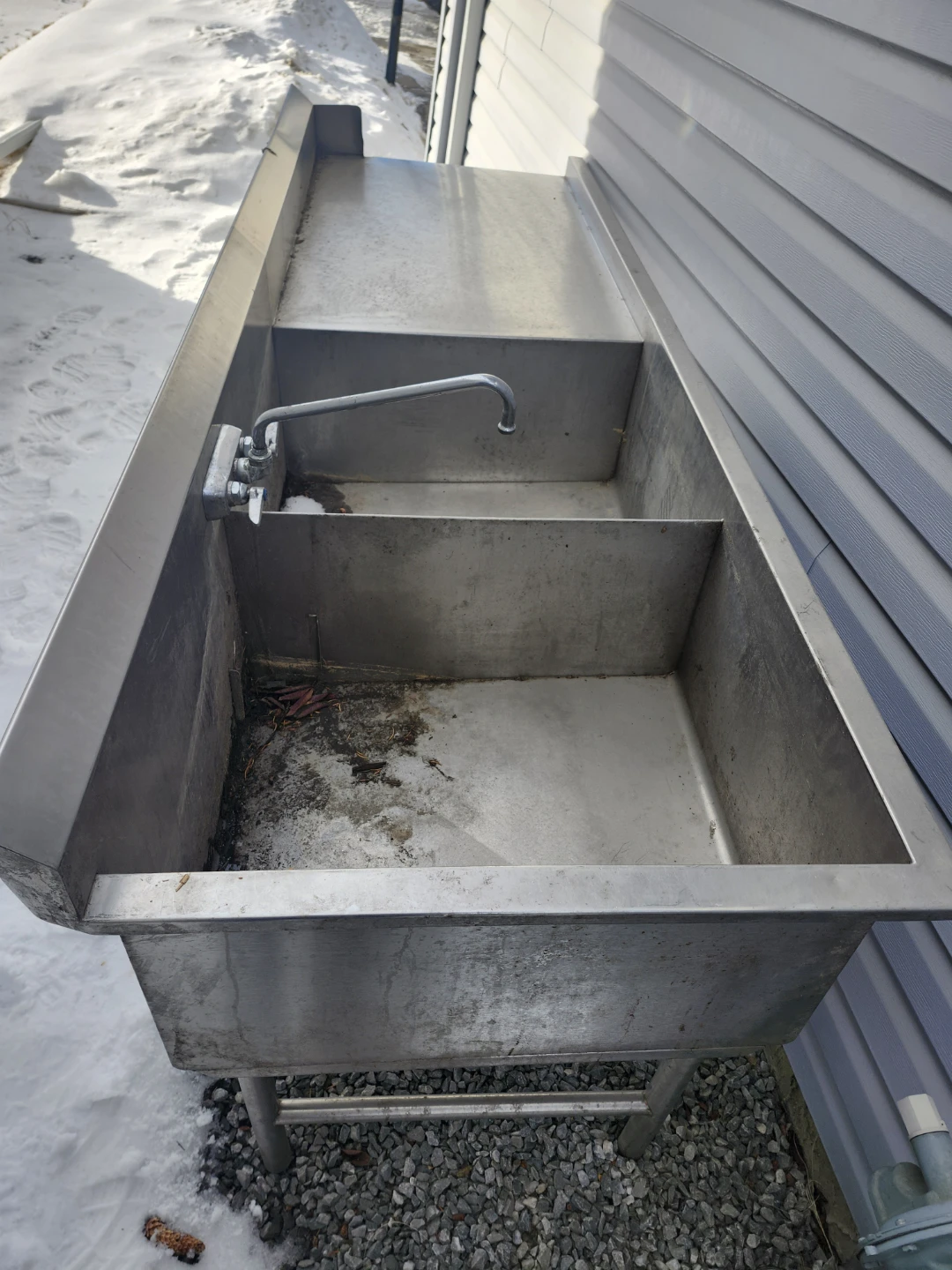Selling a restaurant stainless steel double sink. It's in used condition but still functional. Can also for a garage or workshop!