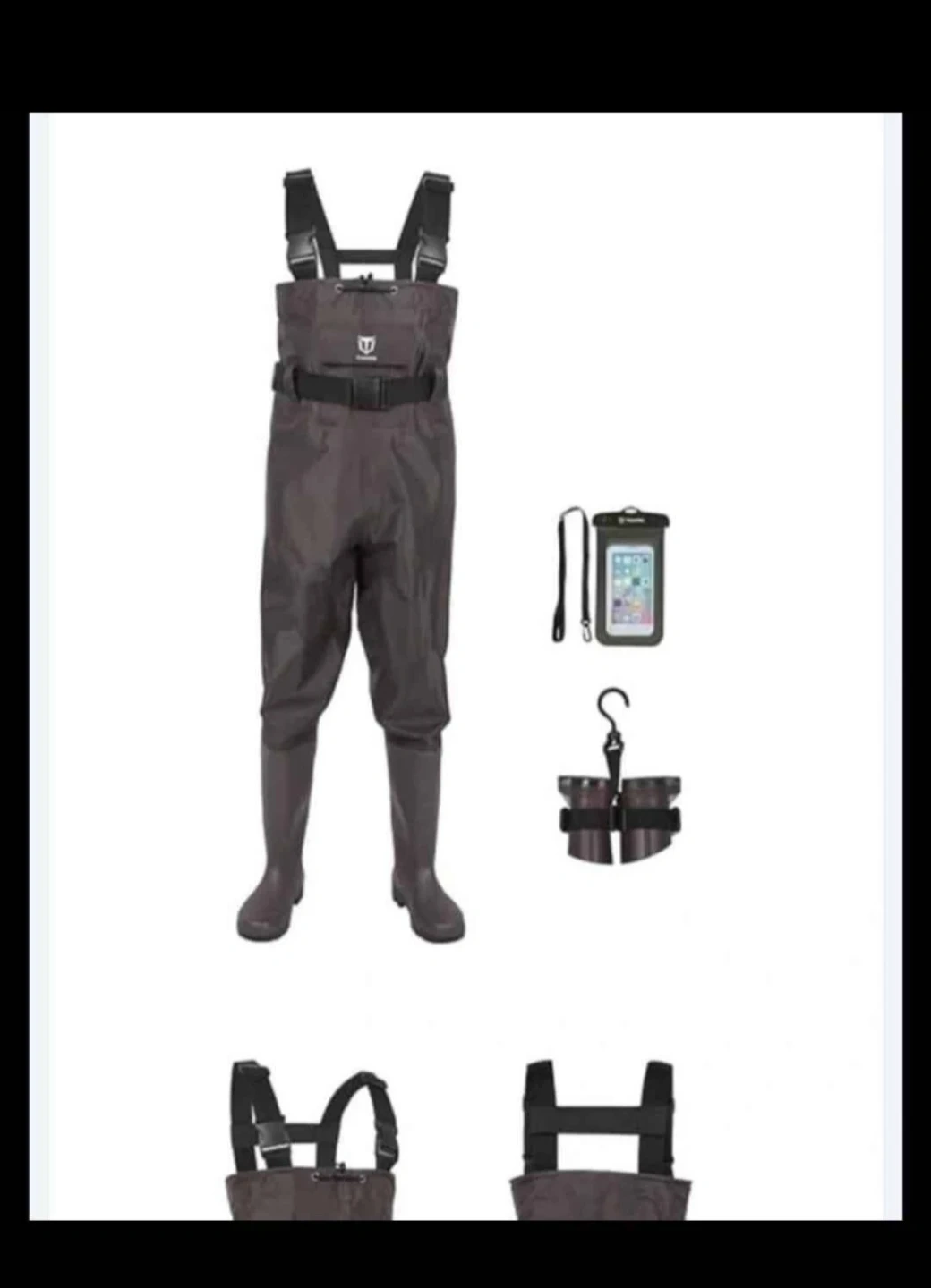 These waders are designed for fishing and other water activities. They come with a waterproof phone pouch and a hanging accessory holder. The material appears to be durable and waterproof, suitable for keeping you dry in wet conditions.