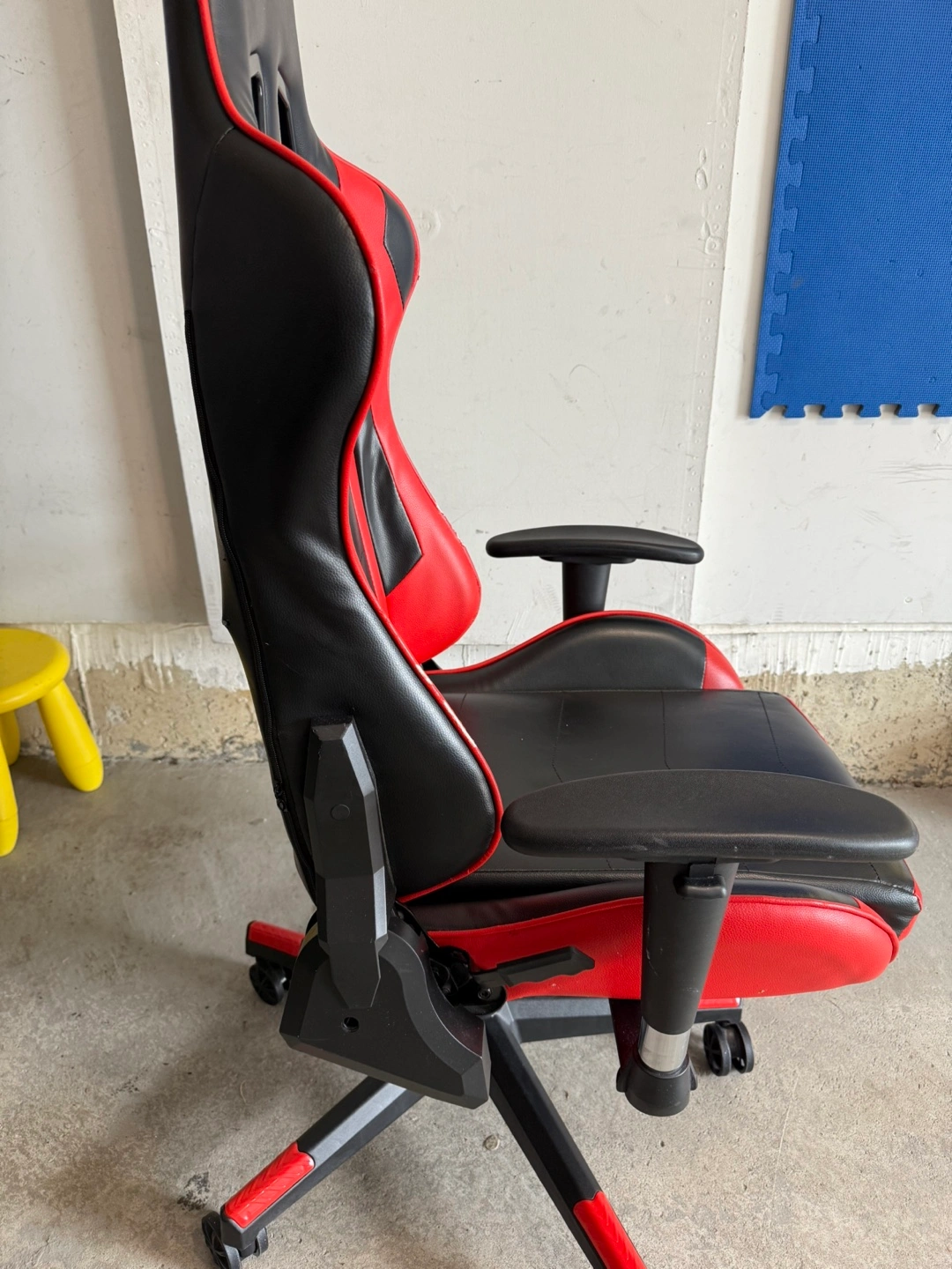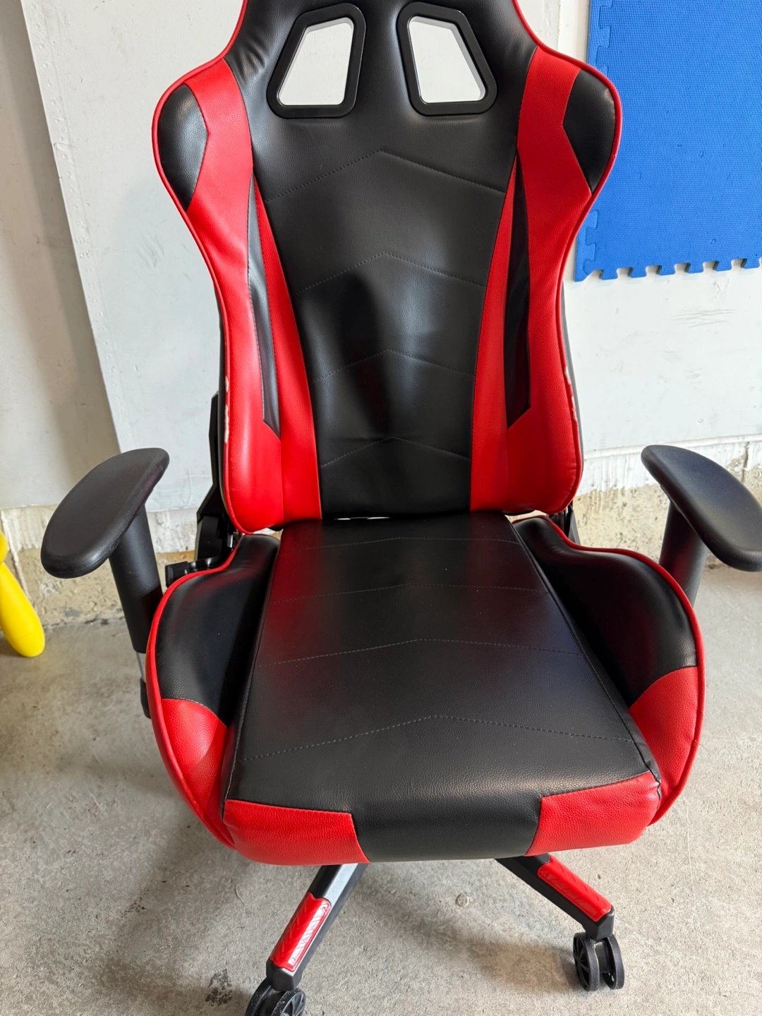 Selling a gaming chair in red and black. There's a small hole on the back, as shown in the photos. Otherwise, it's in good working condition and ready for a new home!