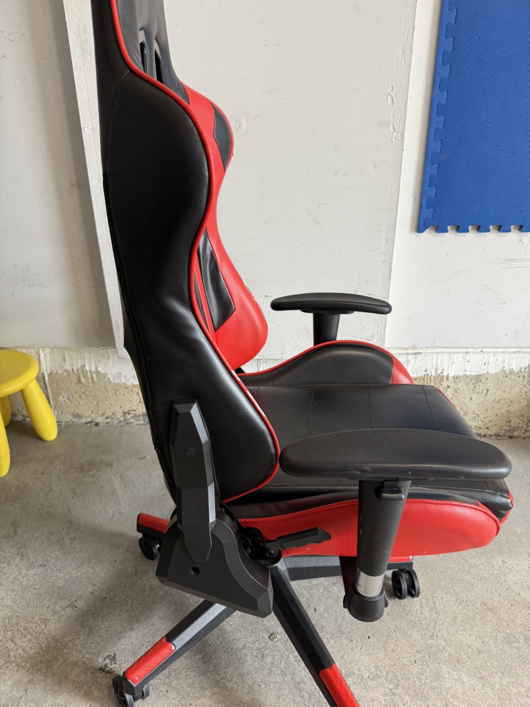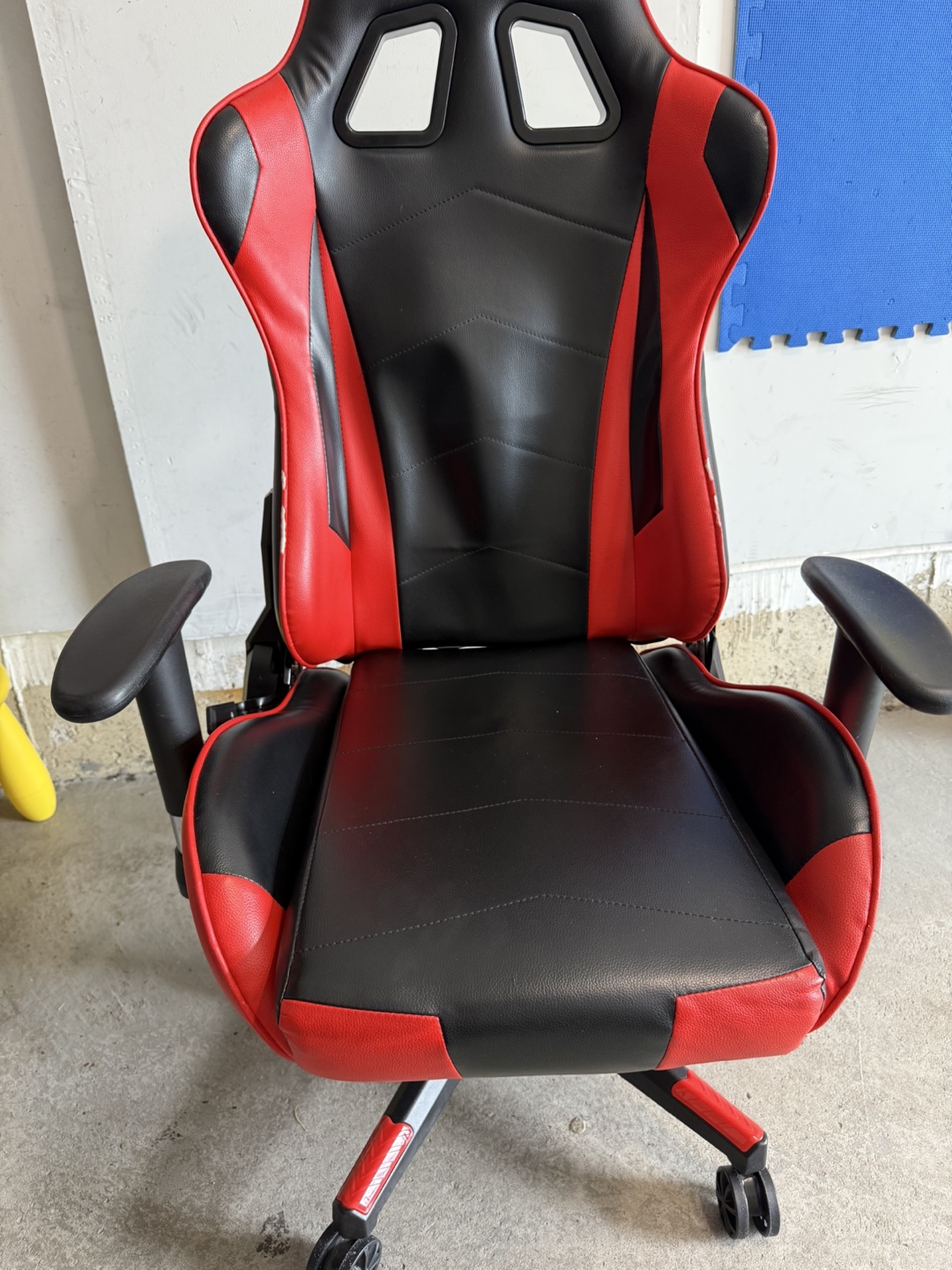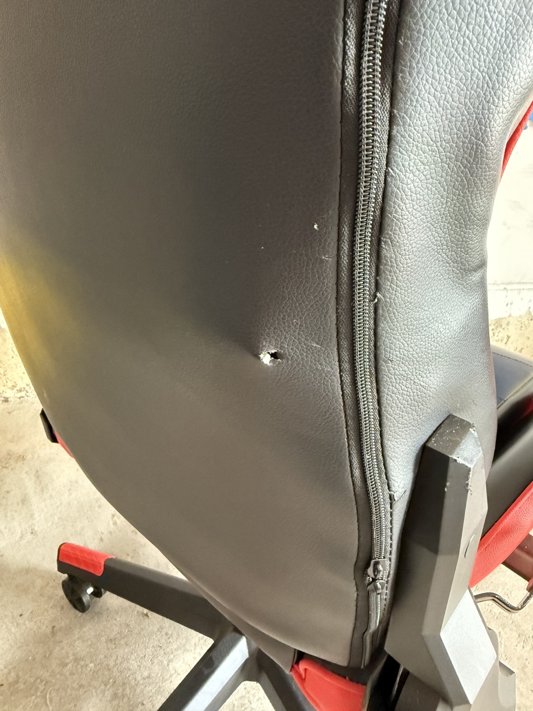 Selling a gaming chair in red and black. There's a small hole on the back, as shown in the photos. Otherwise, it's in good working condition and ready for a new home!