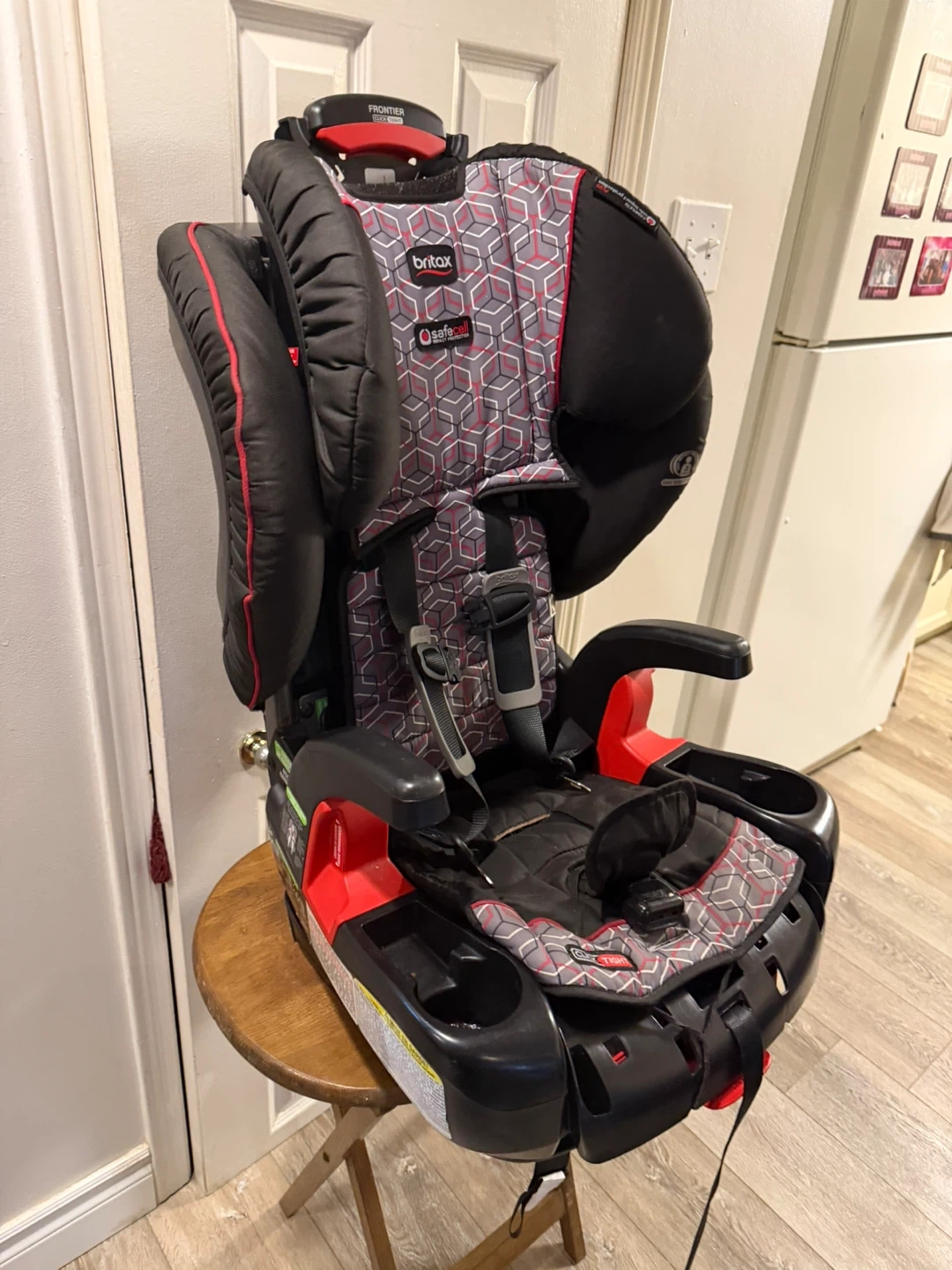 This is a Britax Frontier CT child car seat with a red, grey, and black pattern. It features dual cup holders and a 5-point harness. Made in 2017, it's a solid choice for keeping your little one safe on the road!