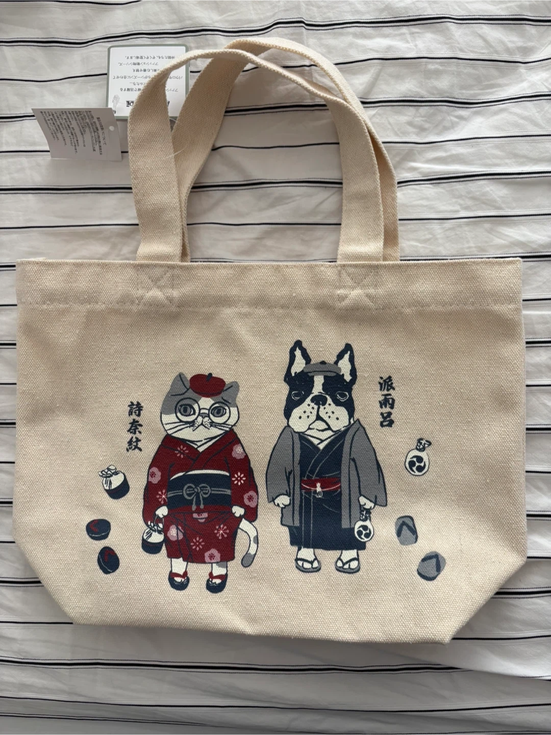 Super cute tote bag featuring a cat and dog in traditional kimono attire! The print is adorable and perfect for everyday use.