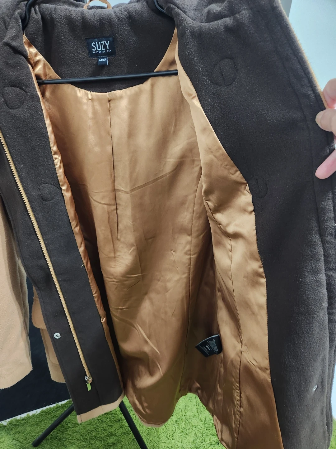 This SUZY duffle coat is a size M/M. It features a tan exterior with a gold satin lining and toggle closures on which the leatherette is peeling off. It's made from a blend of materials for warmth and comfort. Perfect for Spring weather.