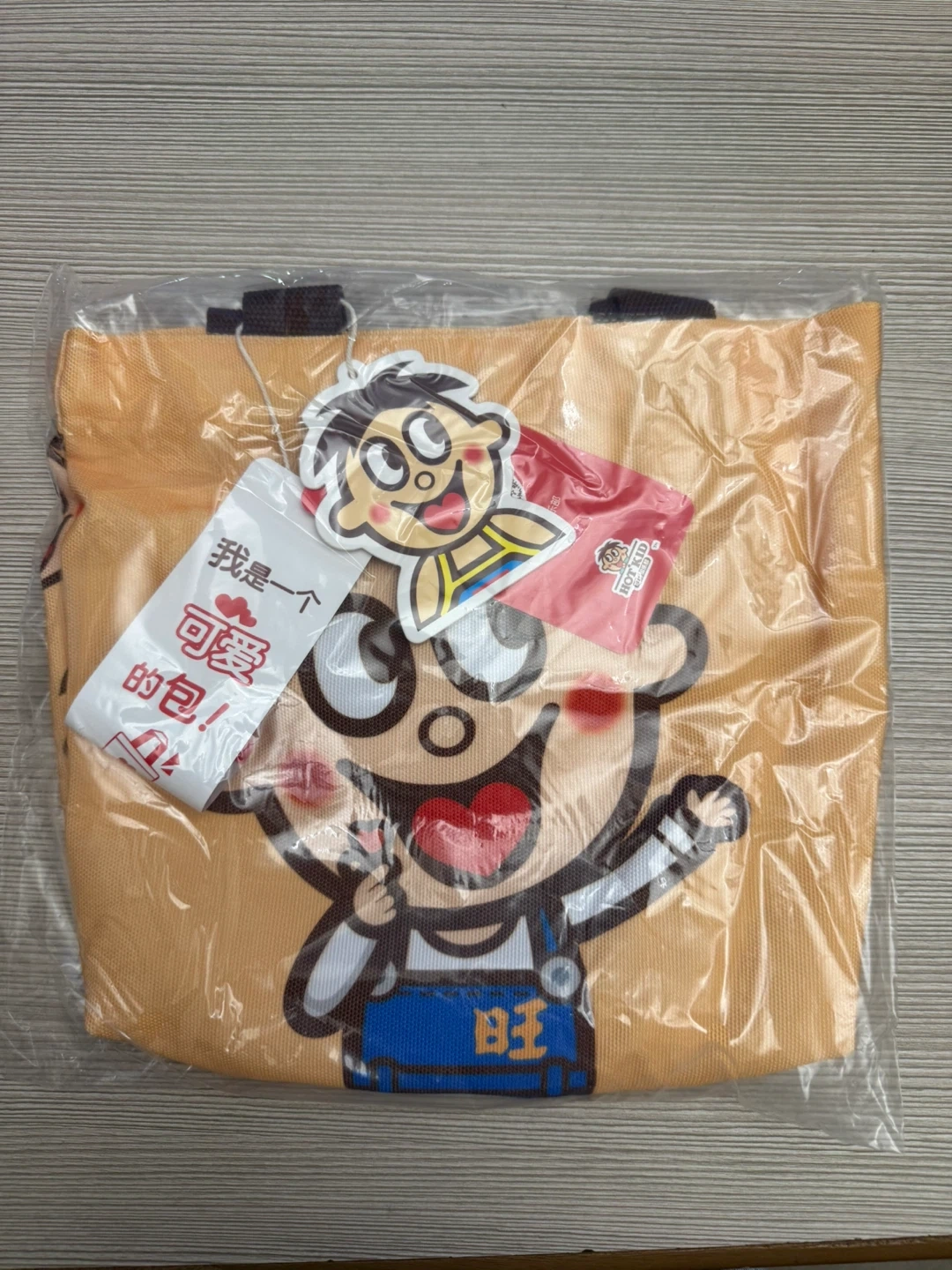 This is a cute tote bag featuring a fun character graphic. It's perfect for carrying everyday essentials or as a fun accessory. The bag is made of durable material.