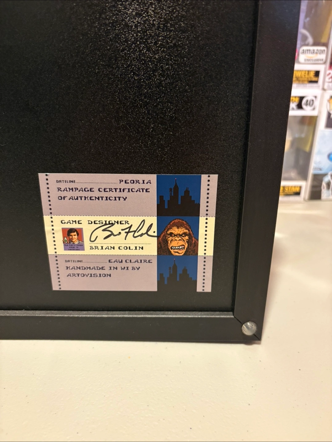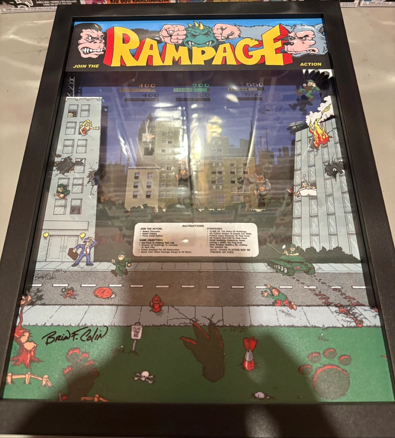 A framed piece of art from the classic arcade game Rampage. Featuring vibrant colours and characters. This piece could be a great addition to any game room, providing a nostalgic and relaxing atmosphere. Comes with creators autographed and certificate of authenticity